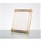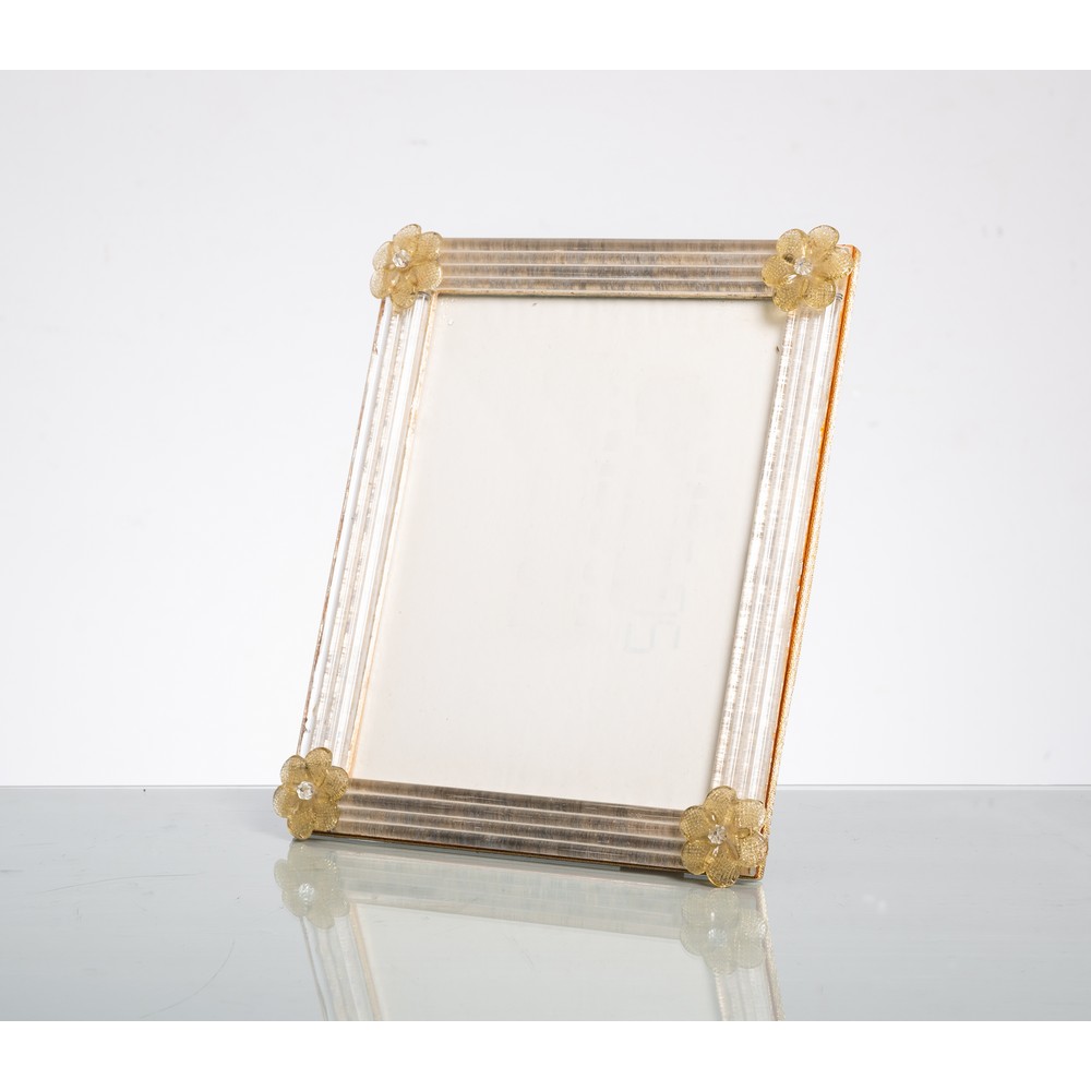 Cornice portaritratti rettangolare decorata sul fronte da cannucce di vetro tortili incolore e oro, decori floreali in vetro oro agli angoli, struttura in legno.