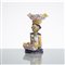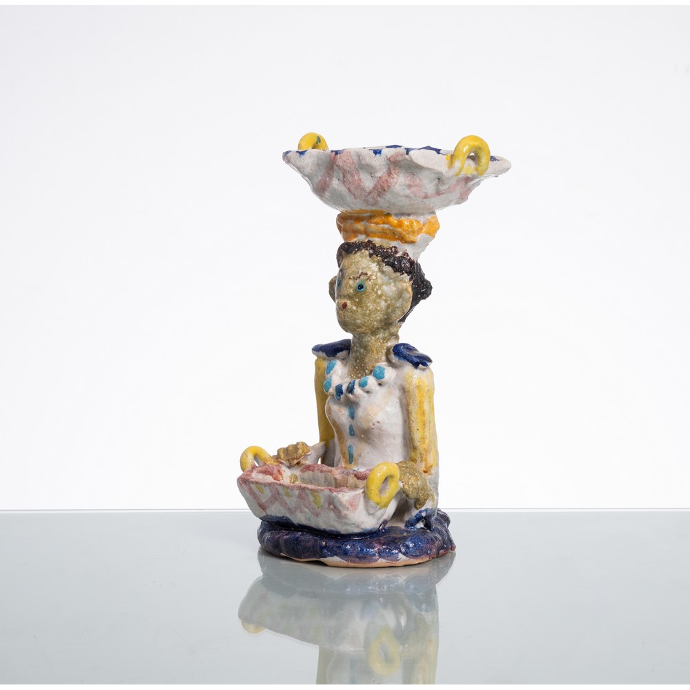 Scultura in ceramica policroma smaltata e invetriata di figura femminile seduta con cesto sulle gambe e sulla testa. Firma sotto la base.