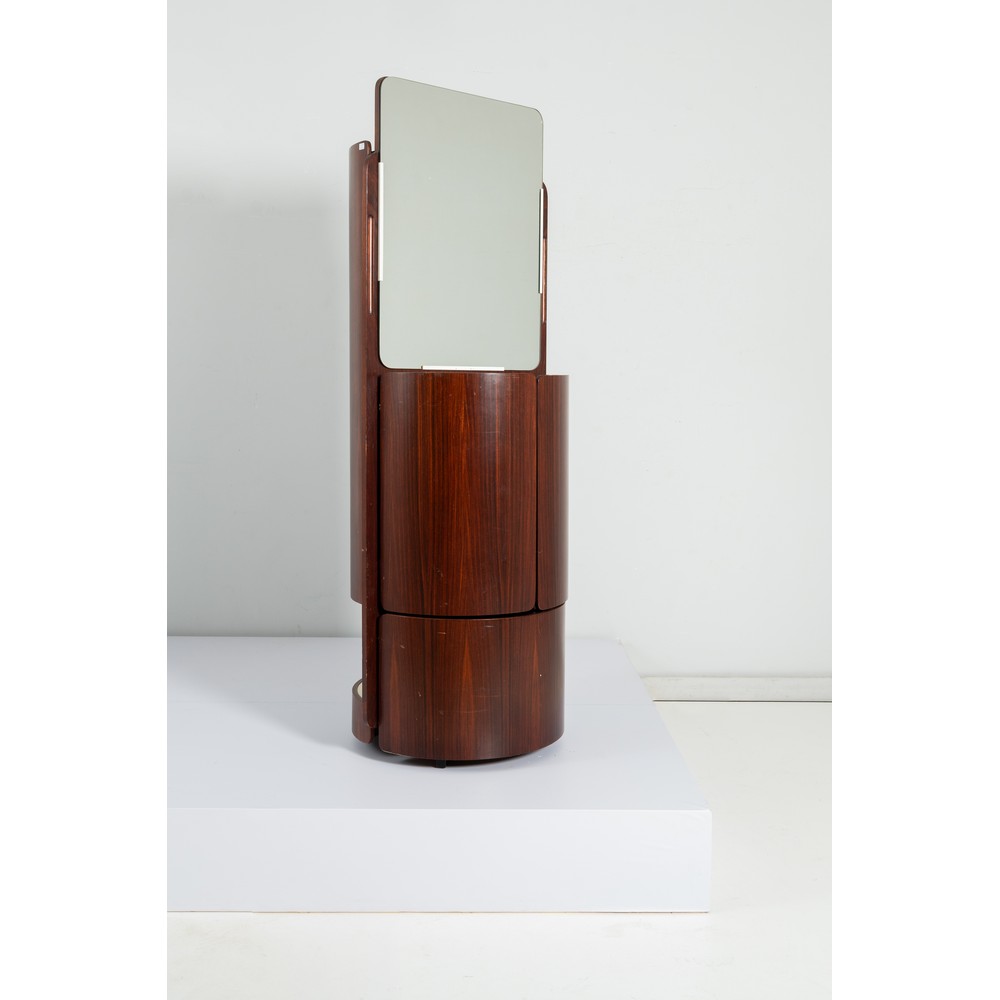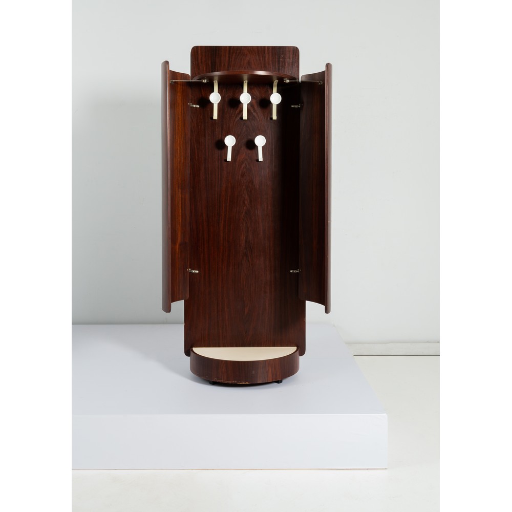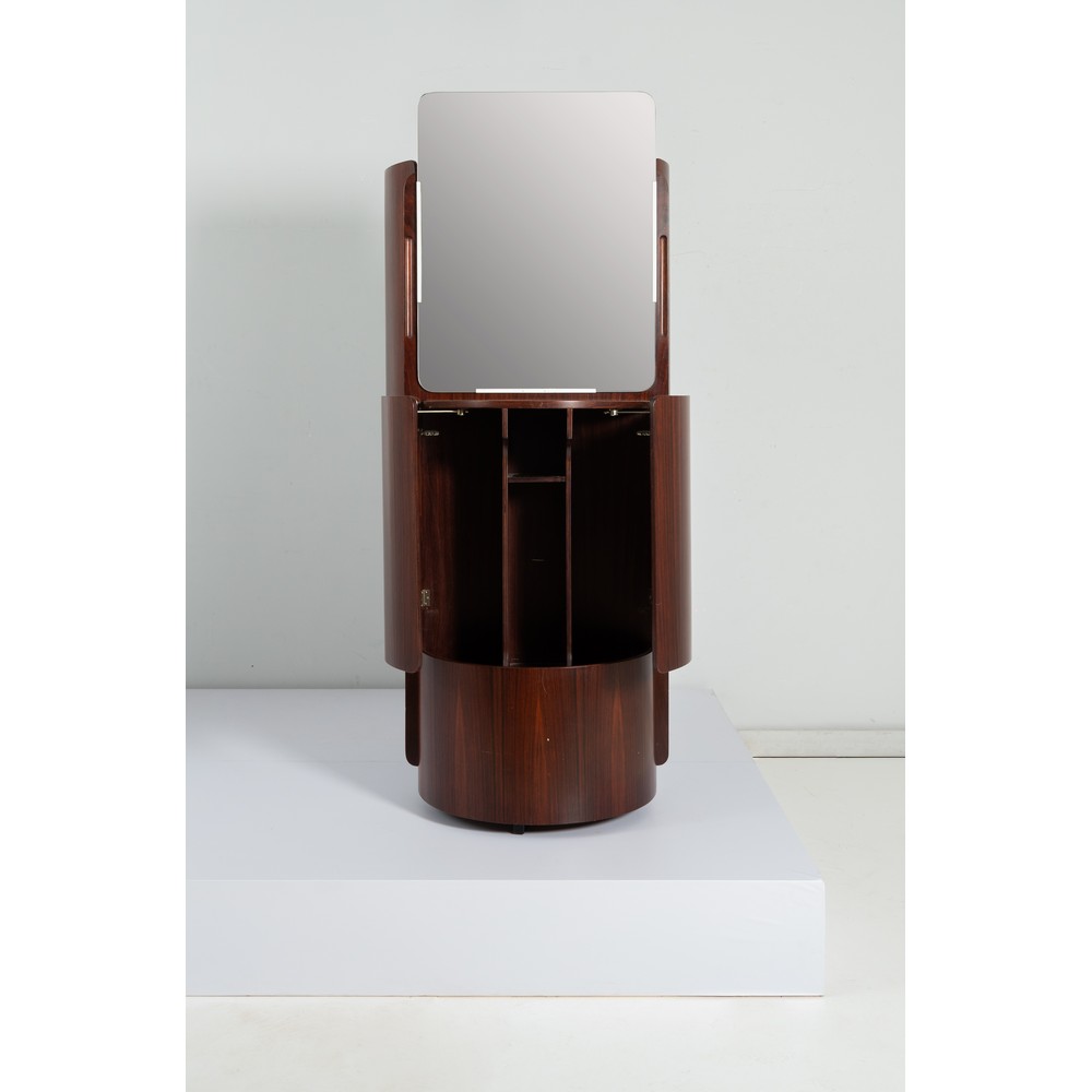 Mobile appendiabiti in legno esotico e formica, corpo cilindrico, da un lato un vano con cinque appendini in metallo verniciato bianco e due ante curve battenti; dall’altro lato uno specchio rettangolare con un vano contenitore ripartito e chiuso da due ante curve battenti. Graffi.