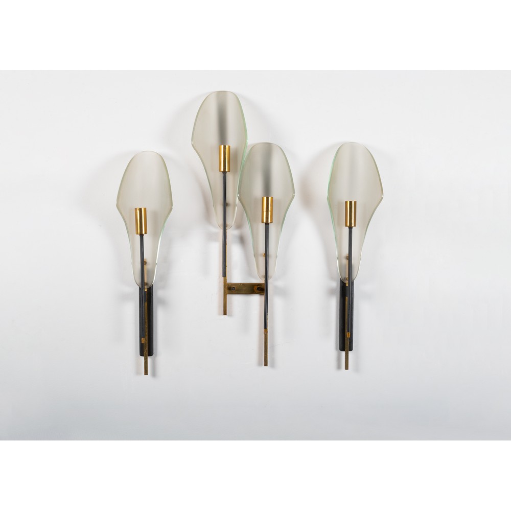 Una lampada da parete a due luci e una coppia di lampade da parete ad una luce ,struttura in ottone e metallo verniciato nero, diffusore in vetro satinato, curvato e sagomato. Lievi ossidazioni.