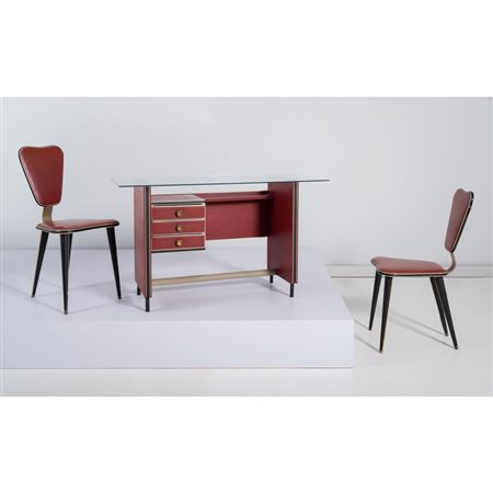Piccolo scrittoio con struttura in acero interamente rivestita in pelle bordeaux e rifiniture in pelle nera. Cassettiera laterale a tre cassetti, maniglie in ottone, piano rettangolare in cristallo trasparente. Piedi a tondino in metallo verniciato nero. Due sedie con struttura in acero rivestito in pelle bordeaux e nera, metallo dotato.