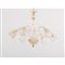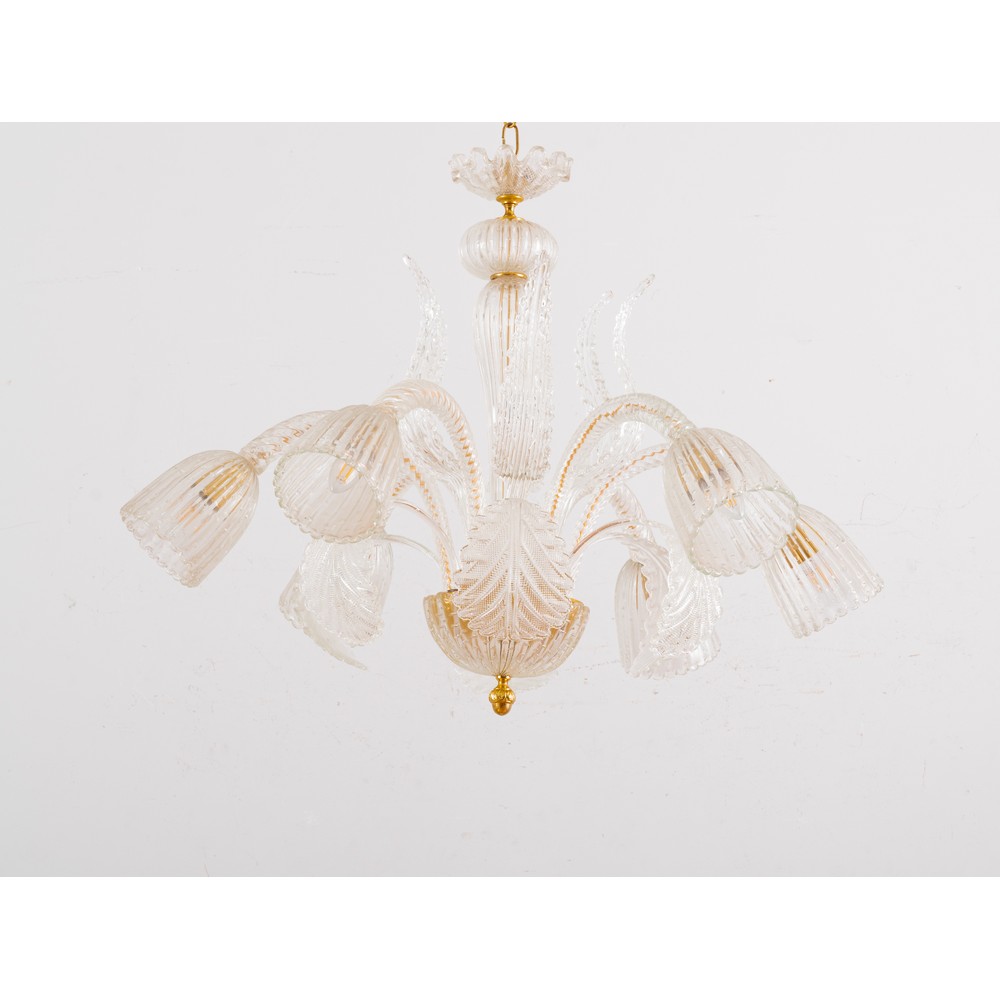 Lampada a sospensione a sei luci in vetro trasparente, bracci curvi in basso con diffusori bullicanti a coppa con bordo smerlato, decori con foglie ed elementi in ottone.
