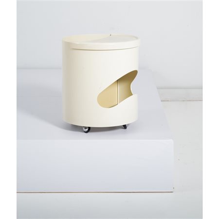 Carrello bar modello “Robo” in materiale plastico bianco, corpo cilindrico con vano portabottiglie su ruote. Marchio di produzione a stampo.