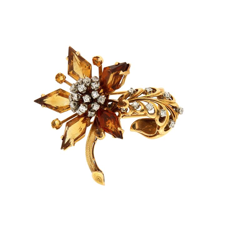 Spilla in oro giallo, a forma di fiore con foglia, quarzi citrini taglio fantasia come petali; al centro e sulla foglia diamanti taglio brillante e 8/8 per complessivi ct 1,0