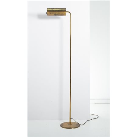Lampada da terra ad una luce, struttura in tubolare di ottone, diffusore orientabile in ottone, base circolare.