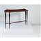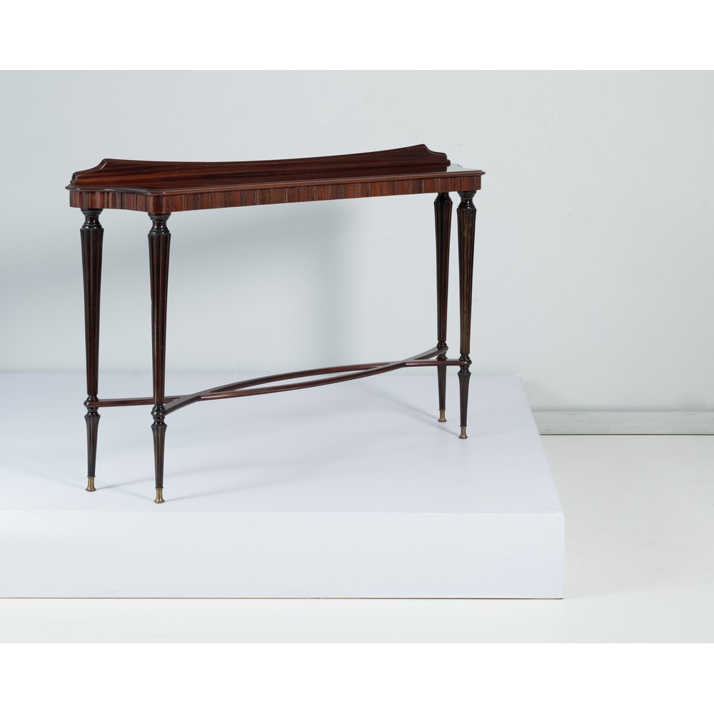 Consolle in legno di mogano, piano sagomato von alzata curvata, fronte decorato con scannellature, piede conico rastremato, crociera curvata, scarpette in ottone.
