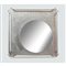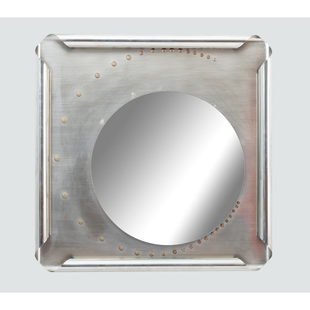 Specchio da parete in acciaio spazzolato e cromato, corpo quadrato con bordi curvati, decori a piccole punteggiature, cristallo specchiato circolare.