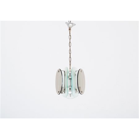 Lampada a sospensione a tre luci, struttura in metallo cromato, diffusori in vetro ovalizzato e curvato satinato e in vetro ovalizzato fumè.