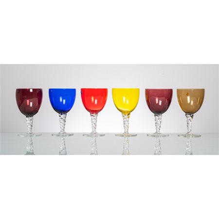 Sei bicchieri a calice in vetro con gambi e piedi trasparenti, coppe di sei colori differenti. Firma alla base.