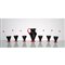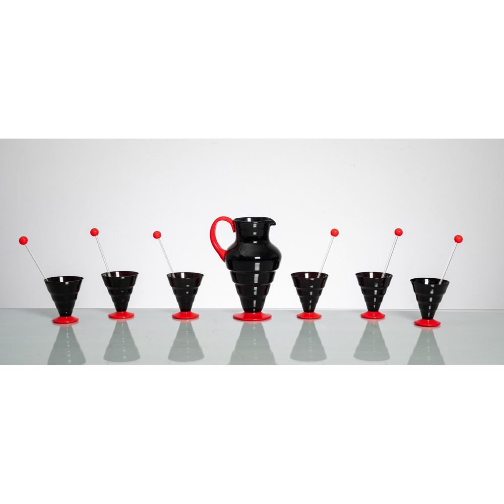 Una caraffa con sei bicchieri in vetro soffiato nero e rosso, sei spiedi per la frutta in vetro trasparente con pomello rosso.