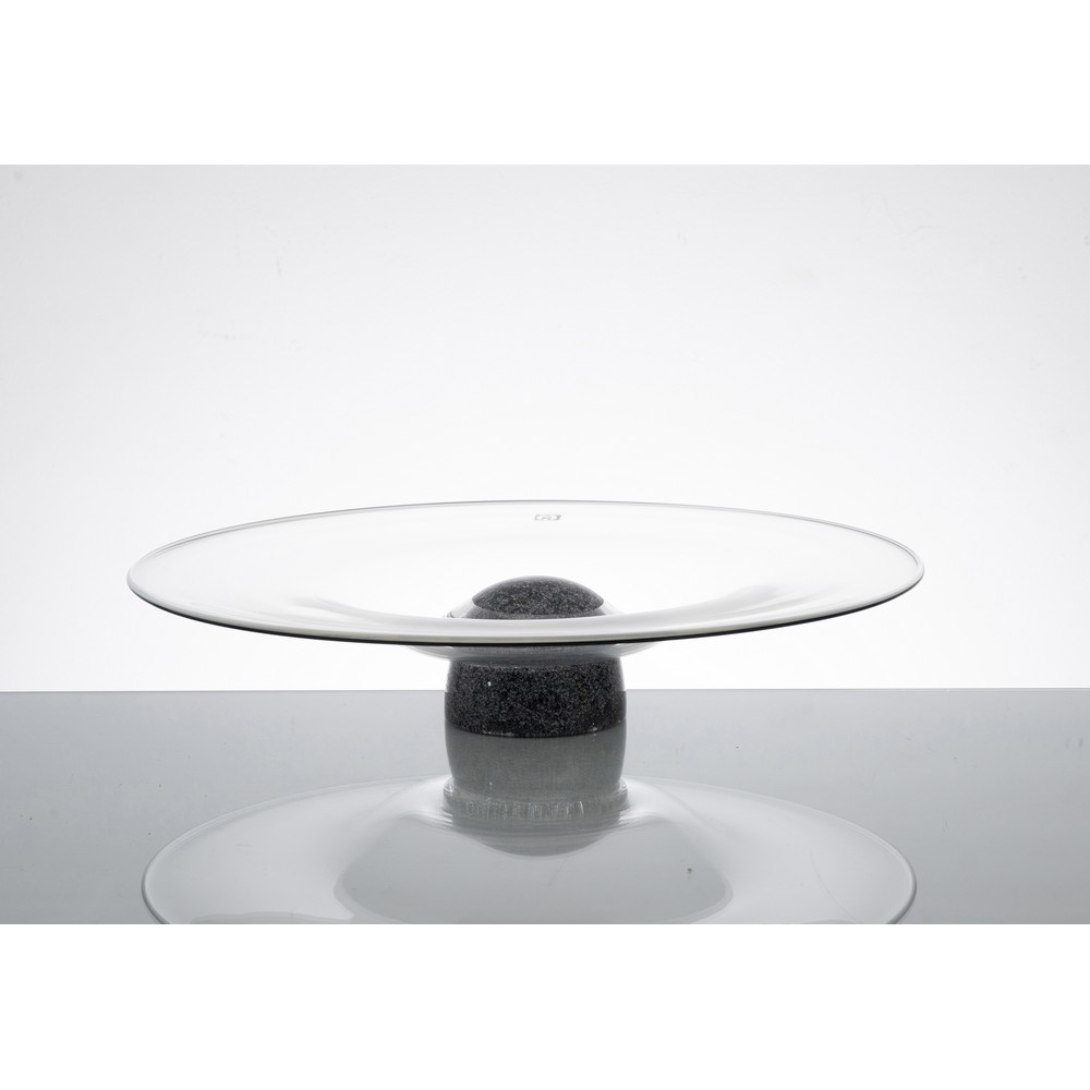 Grande centrotavola circolare in vetro trasparente bordato di nero. Base nera. Imballaggio originale.