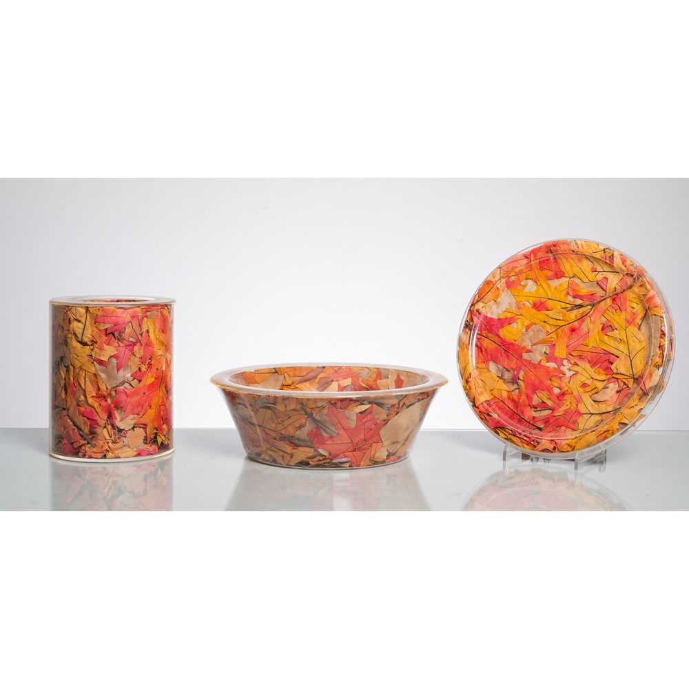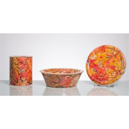 Tre complementi da tavola così composti, un portabottiglie, una coppa ed un vassoio circolare in plexiglass trasparente decorato con foglie secche. Marchio di produzione su un complemento.
