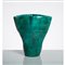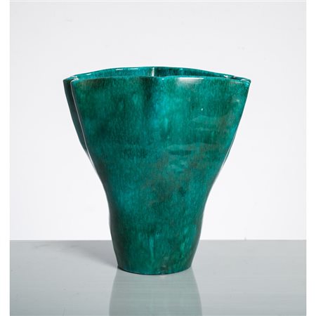 Vaso in terracotta smaltata e invetriata verde, corpo a forma organica con sezione quadrilobata con larga bocca mossa. Lieve sbeccatura sulla base. Firma sotto la base.