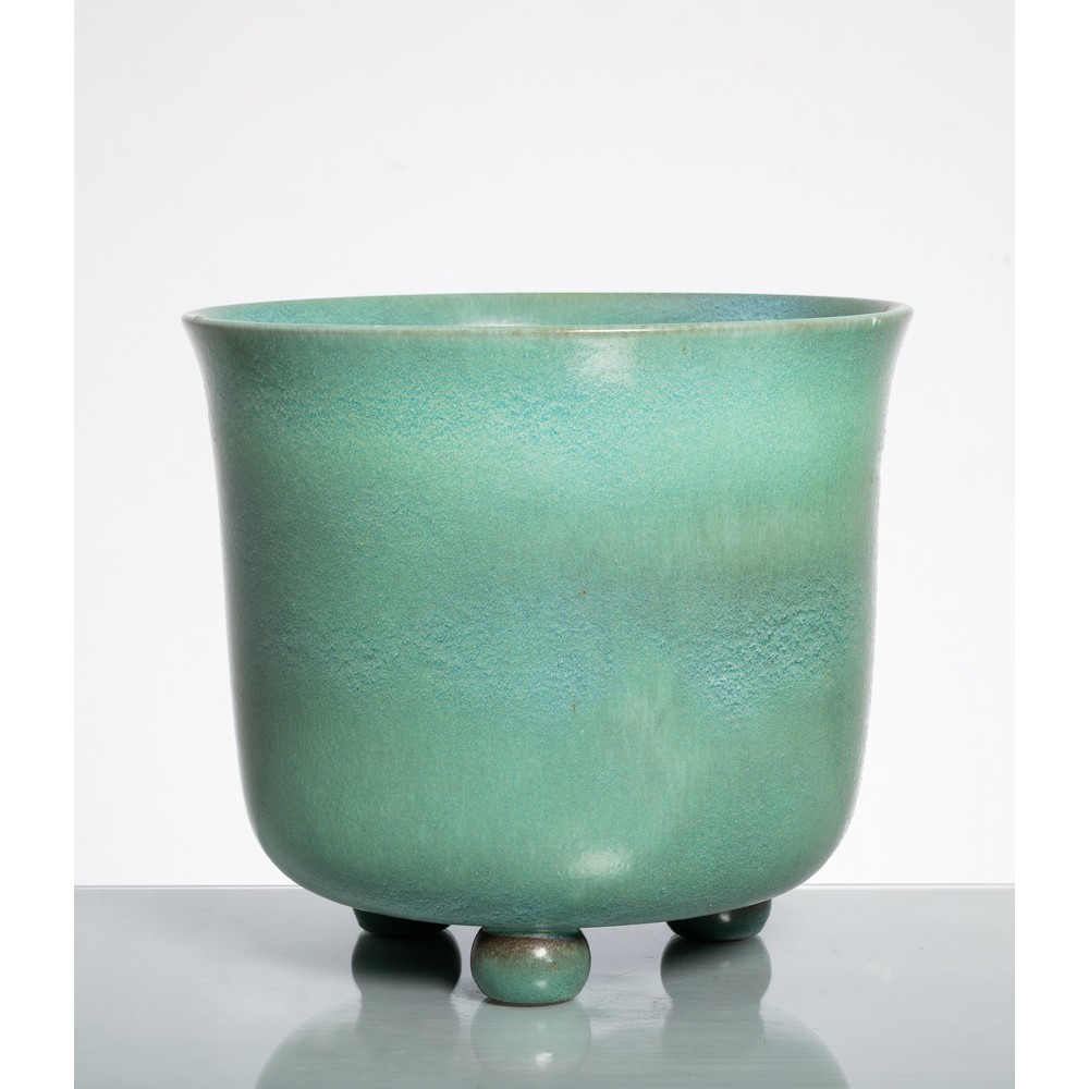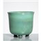 Un cachepot in ceramica smaltata verde, corpo a campana su tre piedi sferici, bocca piana circolare.