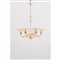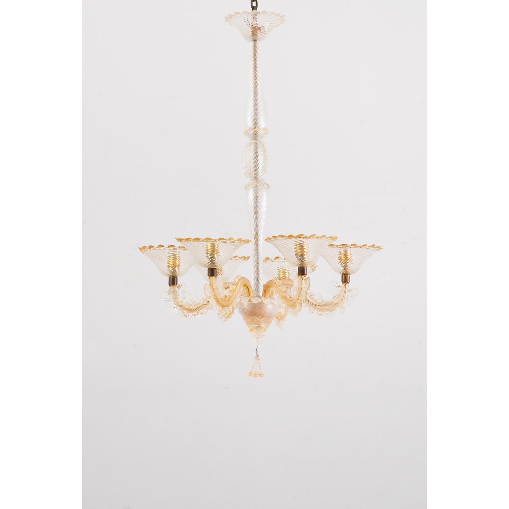 Lampada a sospensione a sei luci, in vetro rigato trasparente e oro, bracci curvi decorati da pizzicature, coppe a campana con bordo pizzicato, ottone, struttura in metallo. Braccio incollato.