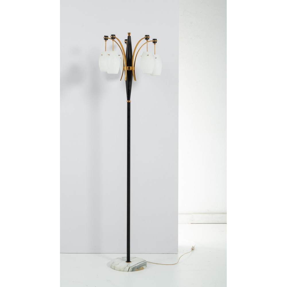Lampada da terra a cinque luci, struttura in metallo verniciato nero ed ottone, diffusori conici in vetro opalino satinato sostenuti da bracci in ottone lievemente curvati, base circolare in marmo.