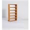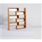Piccola libreria in legno chiaro con meccanismo scorrevole per allungamento in larghezza, due ruote su un fianco.