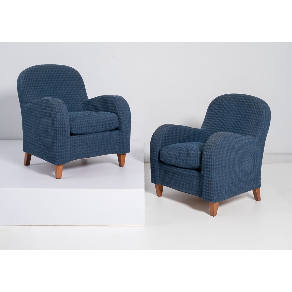 Due poltrone modello “Daisy”, struttura in faggio con rivestimento in tessuto a trama nei toni del blu, cuscini con imbottitura in piume d’oca, piedi in faggio. Marchio di produzione.
