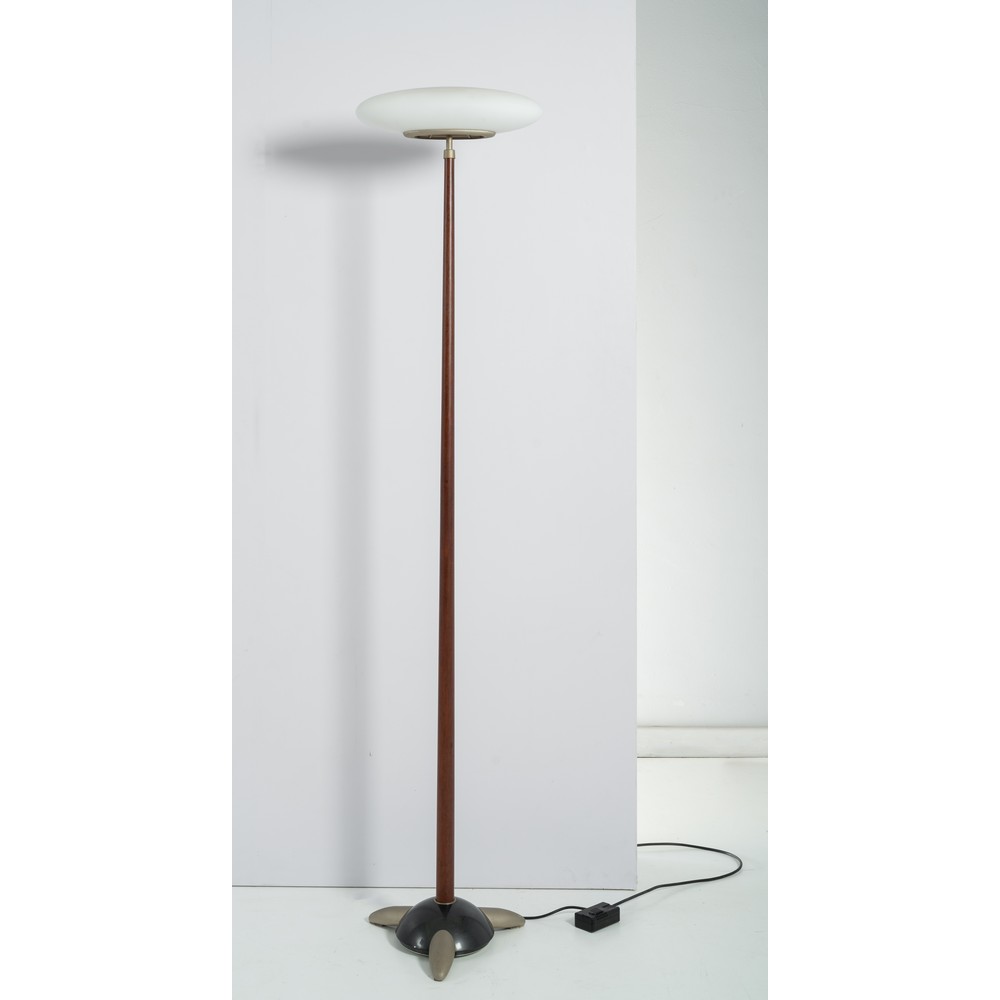 Lampada da terra ad una luce modello “Pao”, fusto in legno di ciliegio con diffusore circolare in vetro smerigliato, base in metallo verniciato. Marchio di produzione.