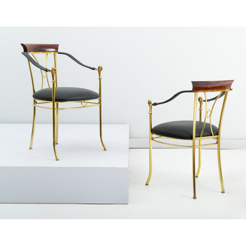 Coppia di sedie con struttura in tubolare di metallo dorato 24 kt, seduta e braccioli in pelle nera, parte superiore della spalliera in legno di mogano, decoro a testa di cigno sul fronte del bracciolo.