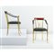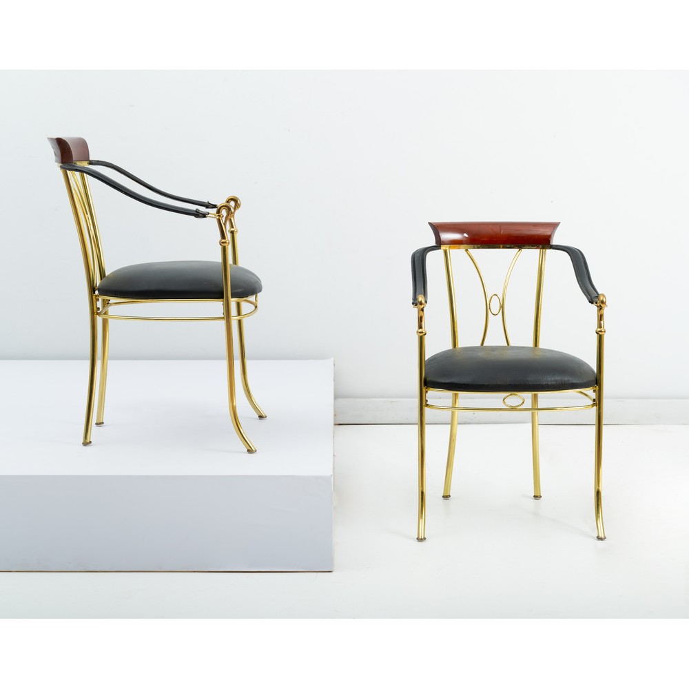 Coppia di sedie con struttura in tubolare di metallo dorato 24 kt, seduta e braccioli in pelle nera, parte superiore della spalliera in legno di mogano, decoro a testa di cigno sul fronte del bracciolo.