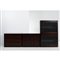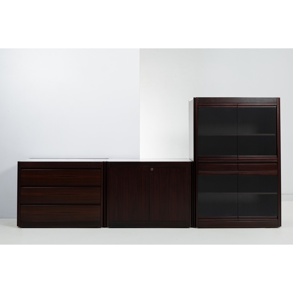 Tre mobili contenitori con ruote della serie “4D” in legno lamellare impiallacciato esotico, uno con vano chiuso, ripiano centrale e ante a battente con chiusura, piano rettangolare in marmo di Carrara incassato; uno con tre cassetti e piano rettangolare in marmo di Carrara incassato; uno a doppia altezza con due ripiani centrali, quattro ante battenti in vetro, piano superiore rettangolare in marmo di Carrara incassato.