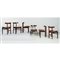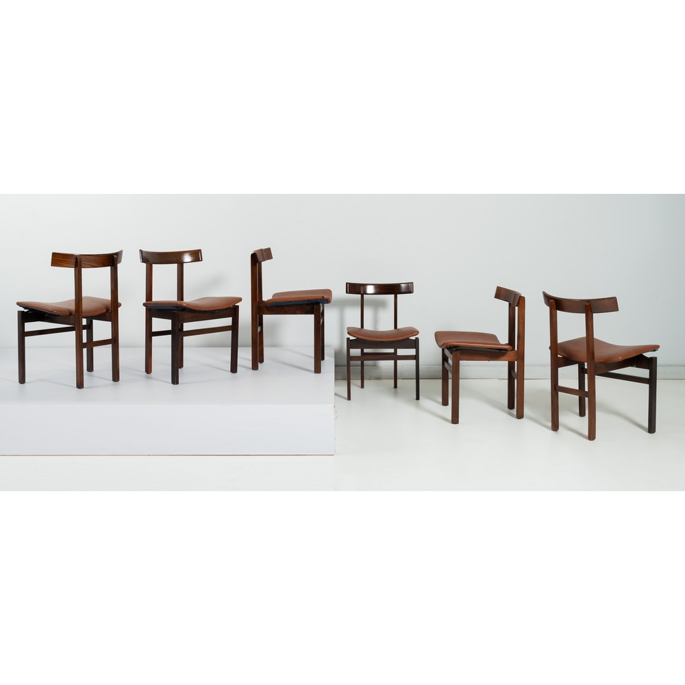 Sei sedie modello "193", struttura sagomata in legno esotico massello, seduta in legno curvato imbottita e tappezzata con skai marrone, schienale in legno curvato. Buone condizioni generali, alcuni piccoli segni di utilizzo.