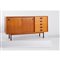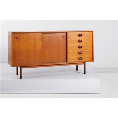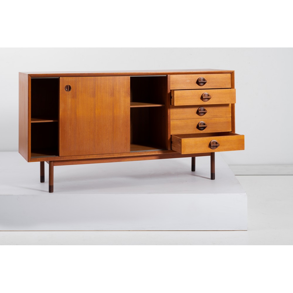 Sideboard in legno di teak modello "Monika", sul fronte un vano chiuso con due ante scorrevoli e due ripiani, di fianco cinque cassetti. Segni d’uso.
