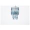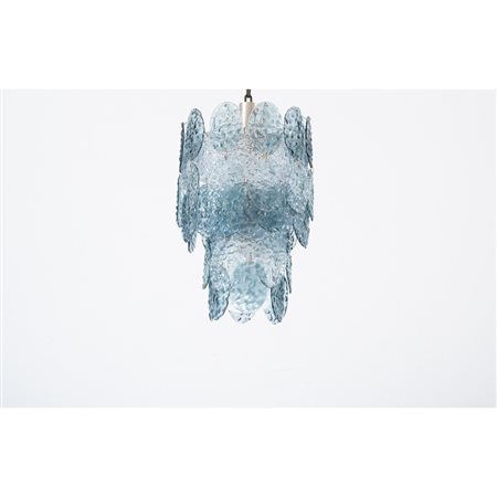 Grande lampada a sospensione modello “Torcello” con struttura in metallo cromato, diffusore a doppio cono composto da elementi modulari ovali con sfumature grigio blu in vetro di Murano bugnato rifrangente lavorato a mano, coppa di chiusura in vetro lattimo corrugato.