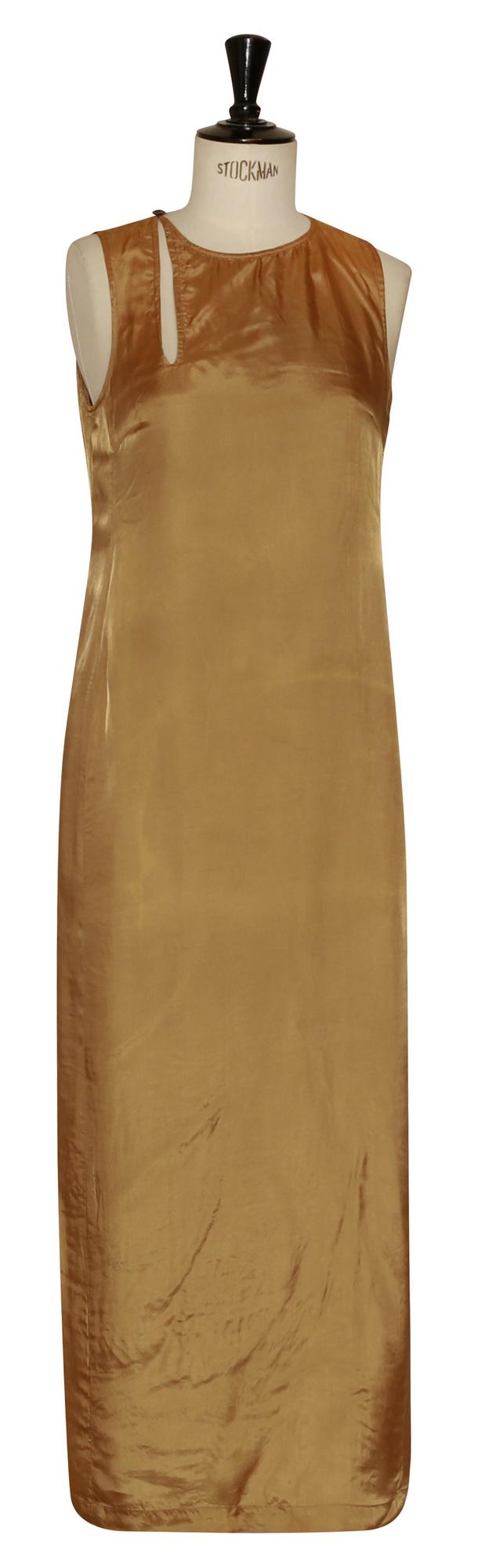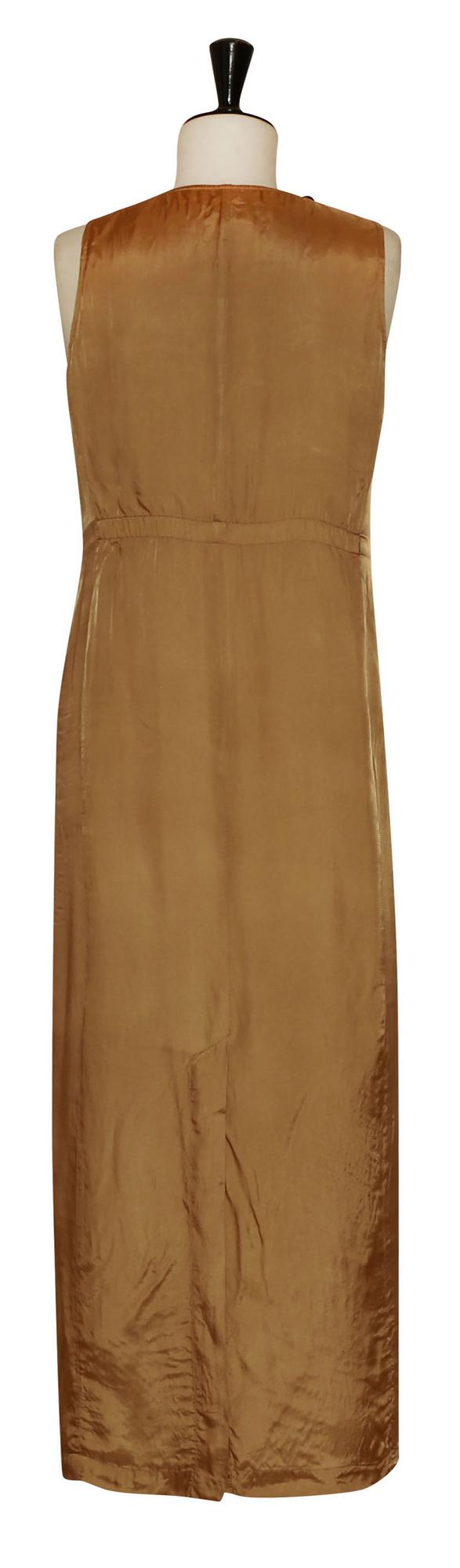Vestito lungo senza maniche di colore senape. Tessuto viscosa cupro. Made in Belgio negli anni '90. Taglia 36. Ben conservato.