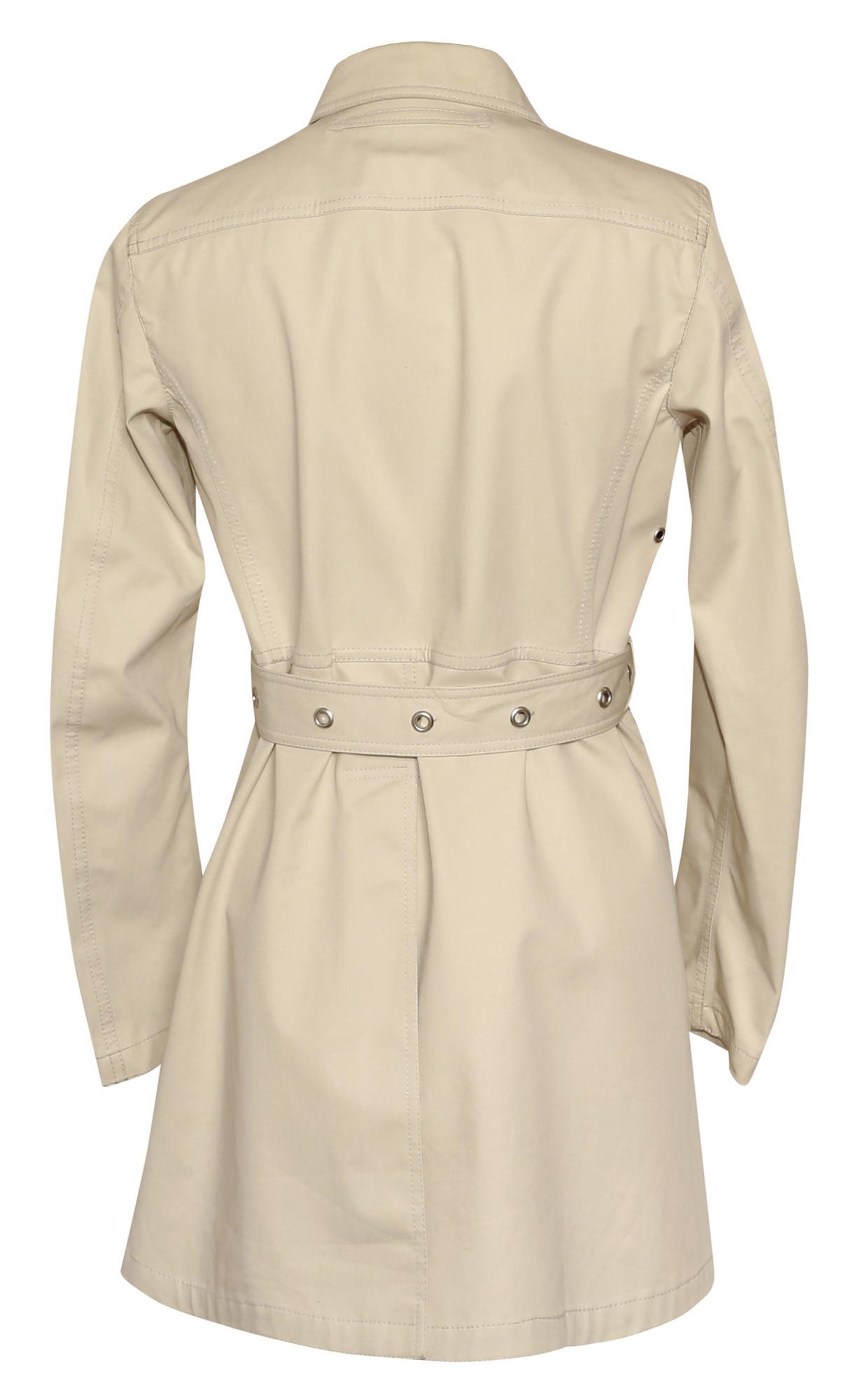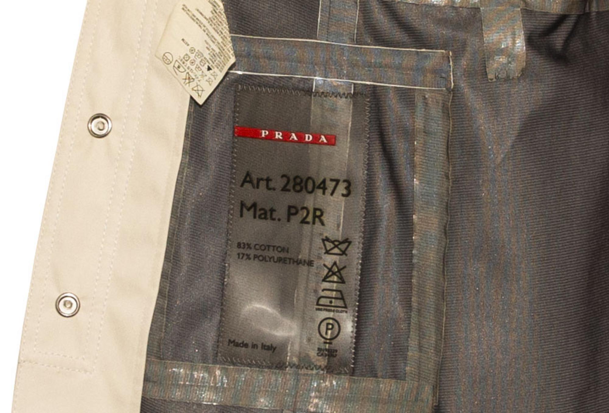 Stile Sahara per questa giacca realizzata in tessuto tecnico impermeabile in cotone e poliuretano di colore bianco sporco, cintura, quattro tasche applicate, bottoni automatici in metallo e anelli in metallo. Fatto in Italia. Primi anni 2000. Taglia IT 42. Eccellente.