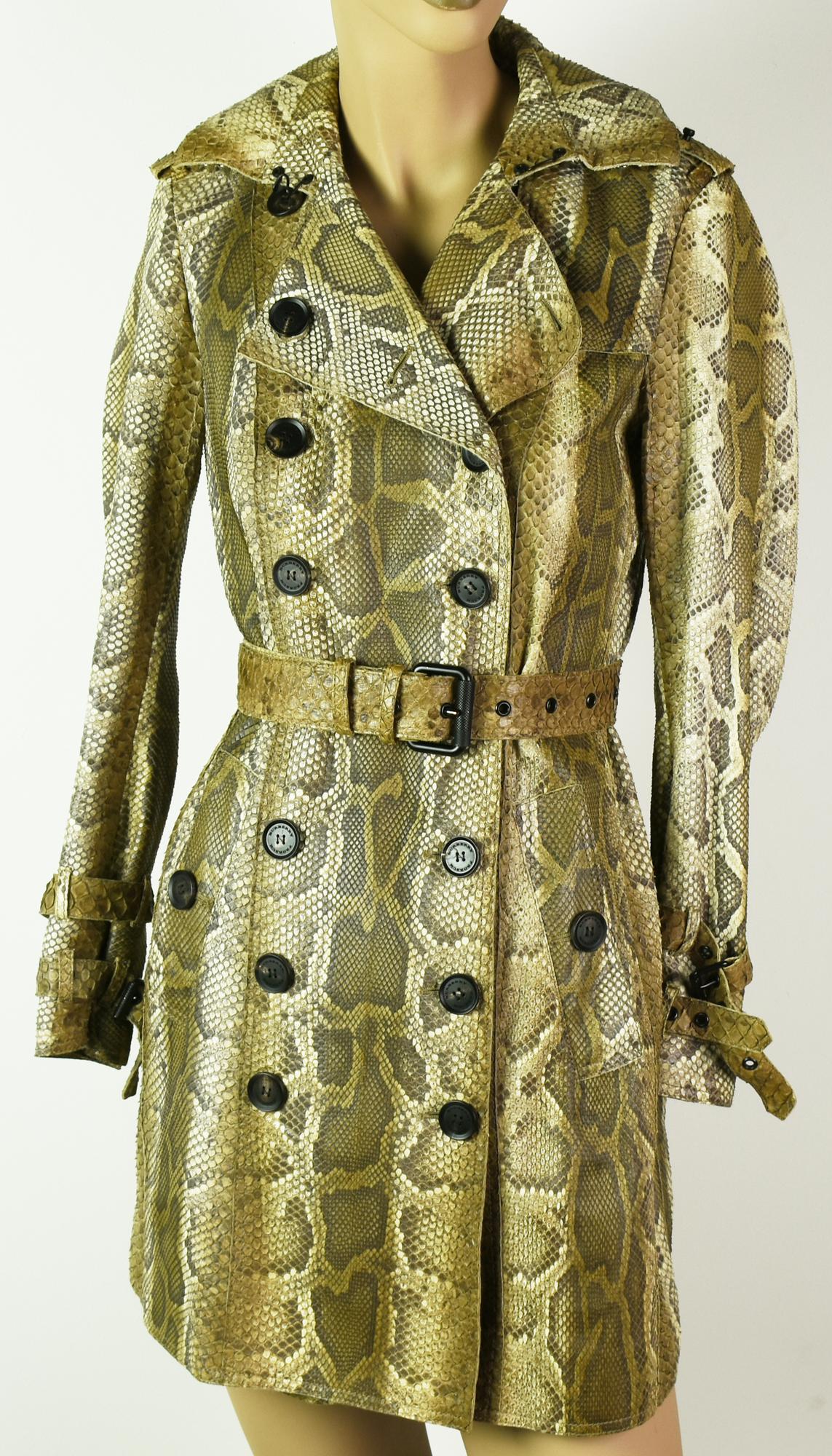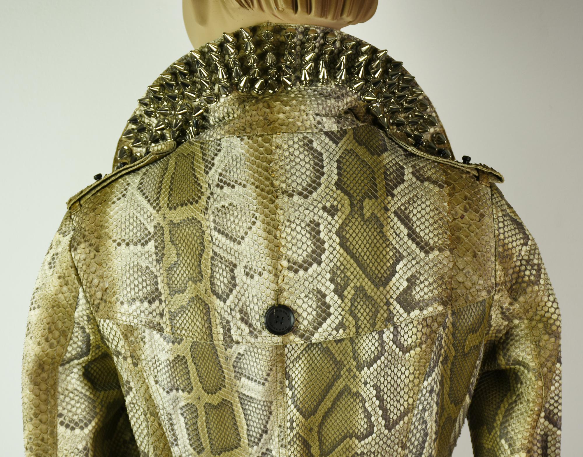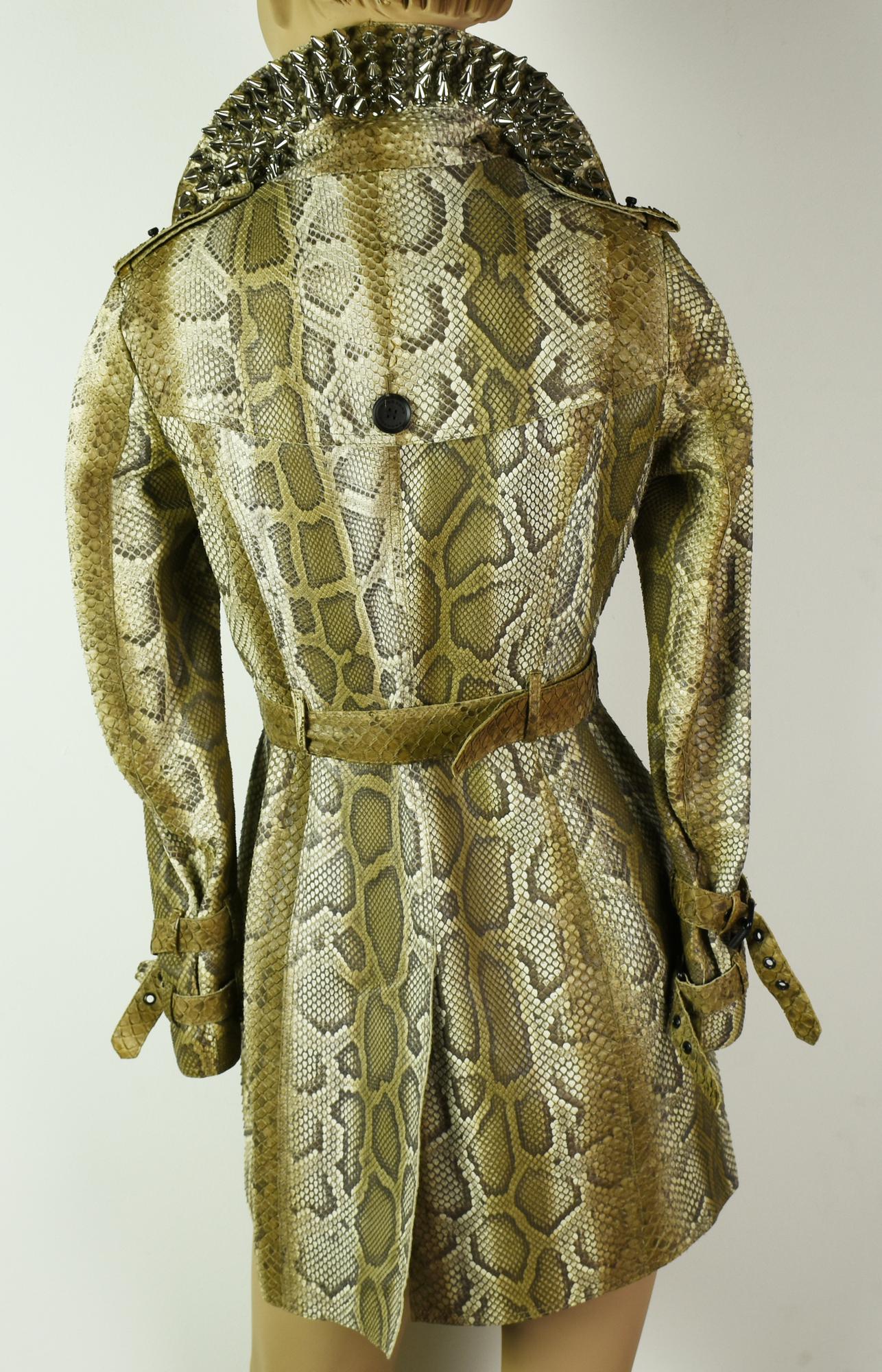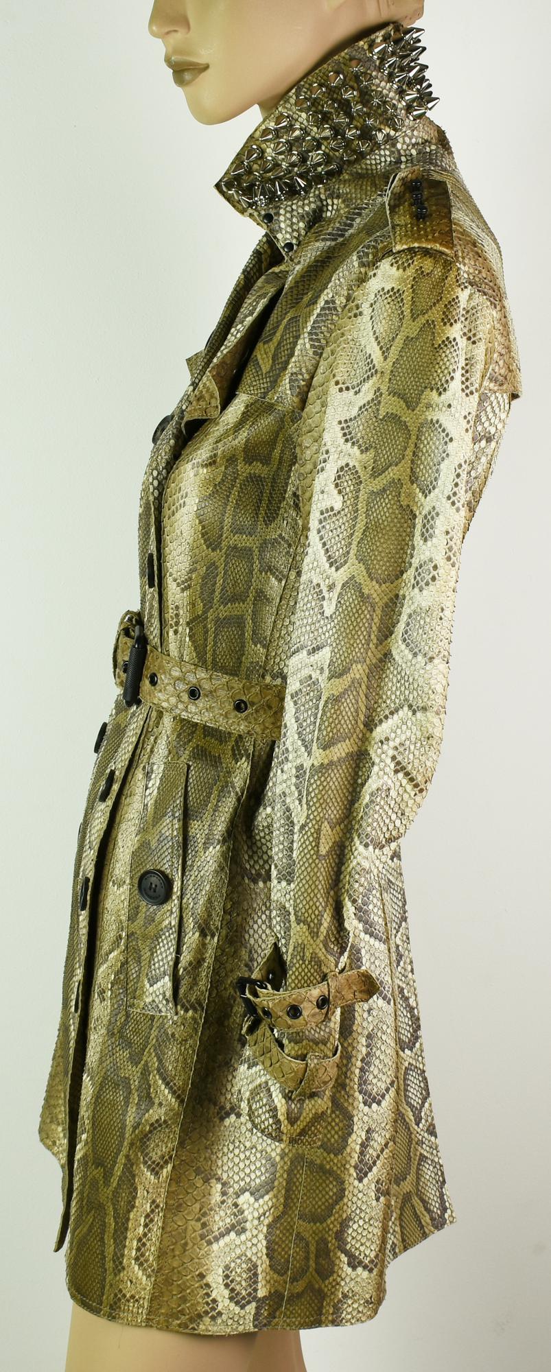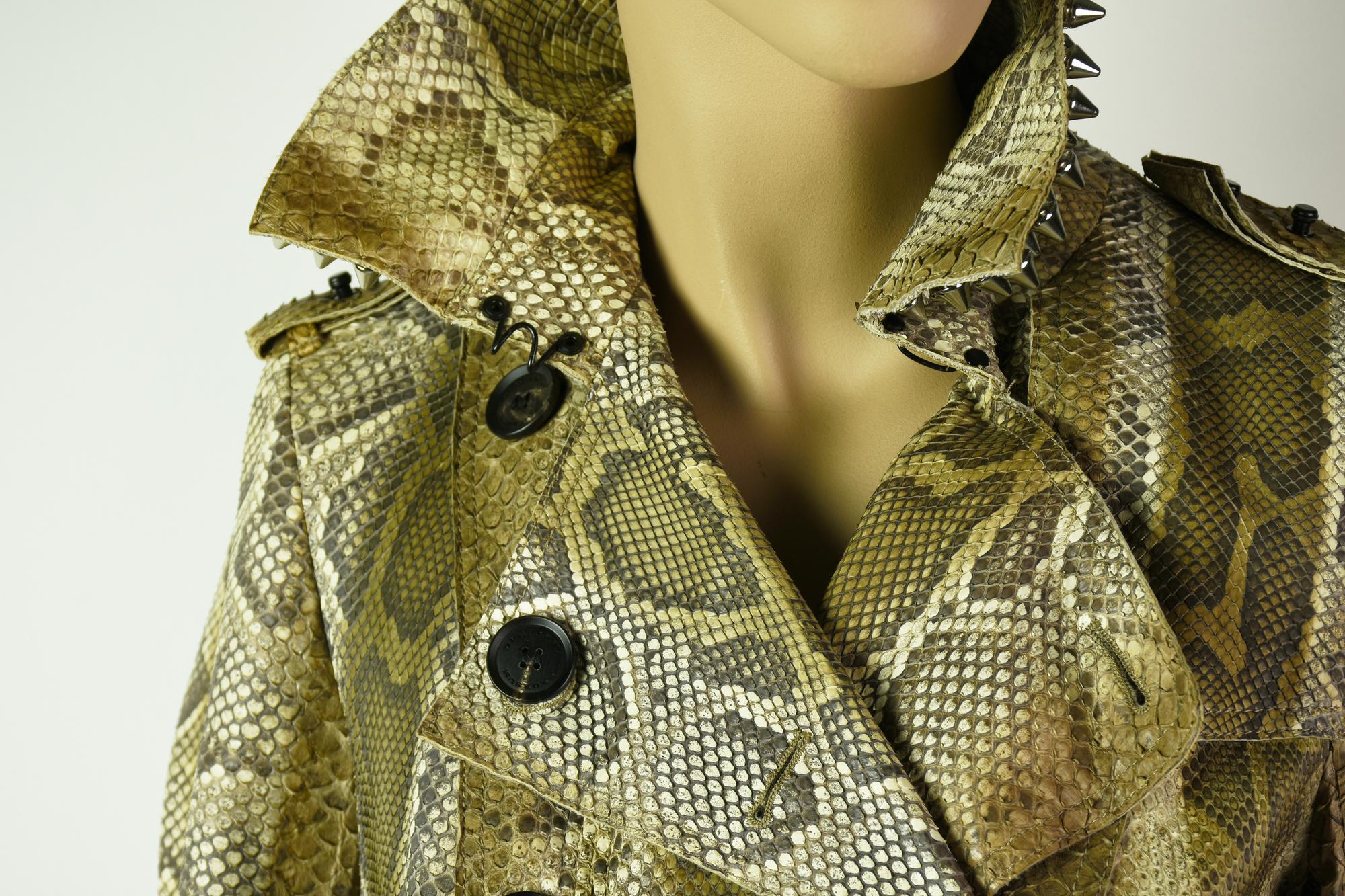 Burberry Prorsum real python double-breasted trench coat. Metal studs on the collar. Matching belt. Spring / summer 2011. Made in Italy. Size 38. Perfectly preserved.