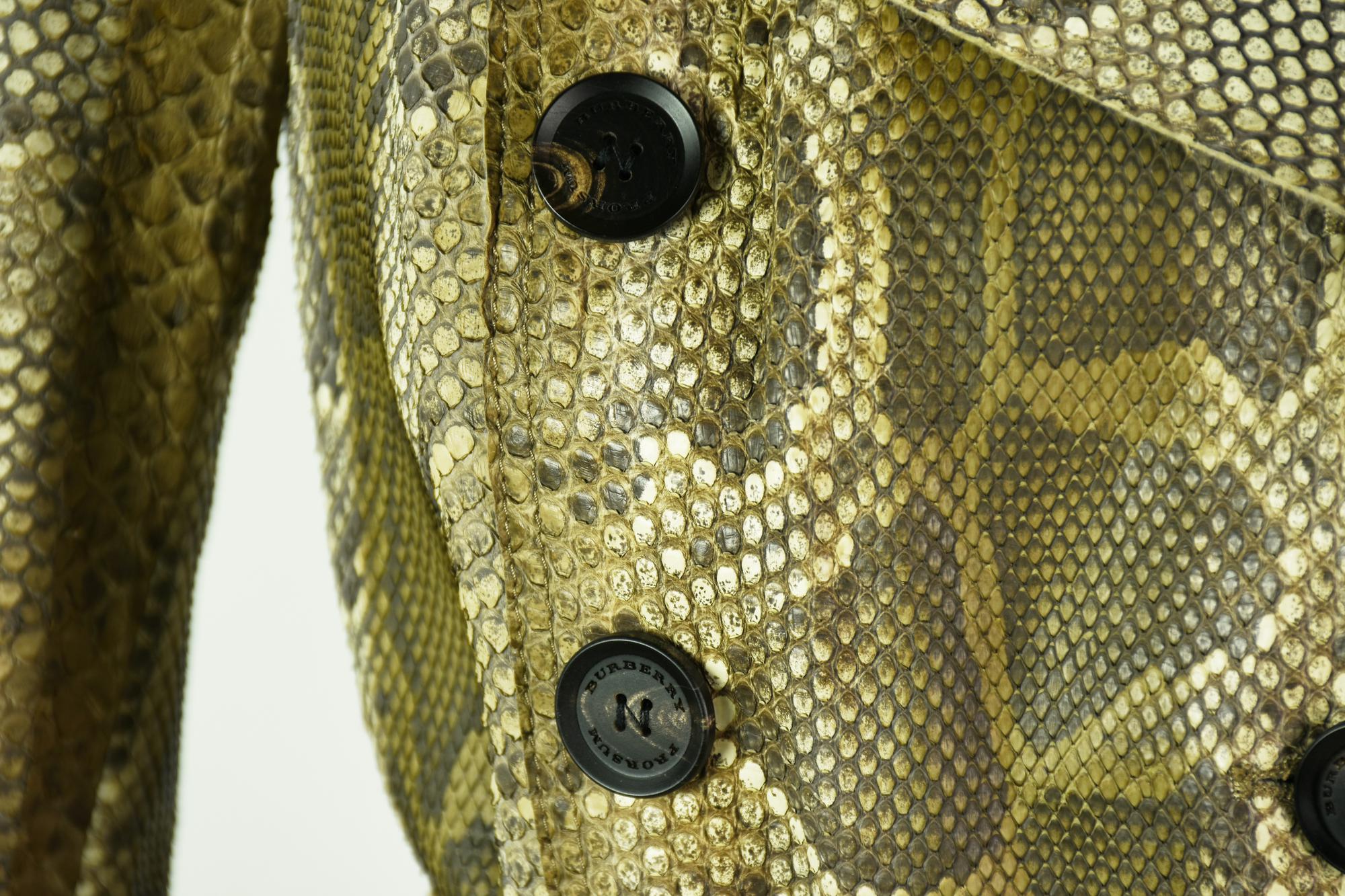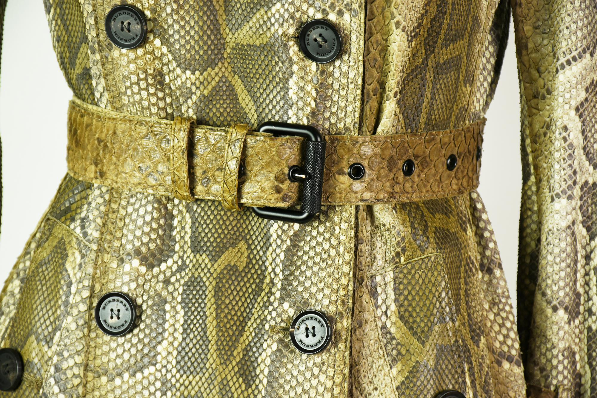 Trench doppiopetto Burberry Prorsum in vero pitone. Borchie metalliche sul colletto. Cintura abbinata. Primavera / estate 2011. Prodotto in Italia. Taglia 38. Perfettamente conservato.