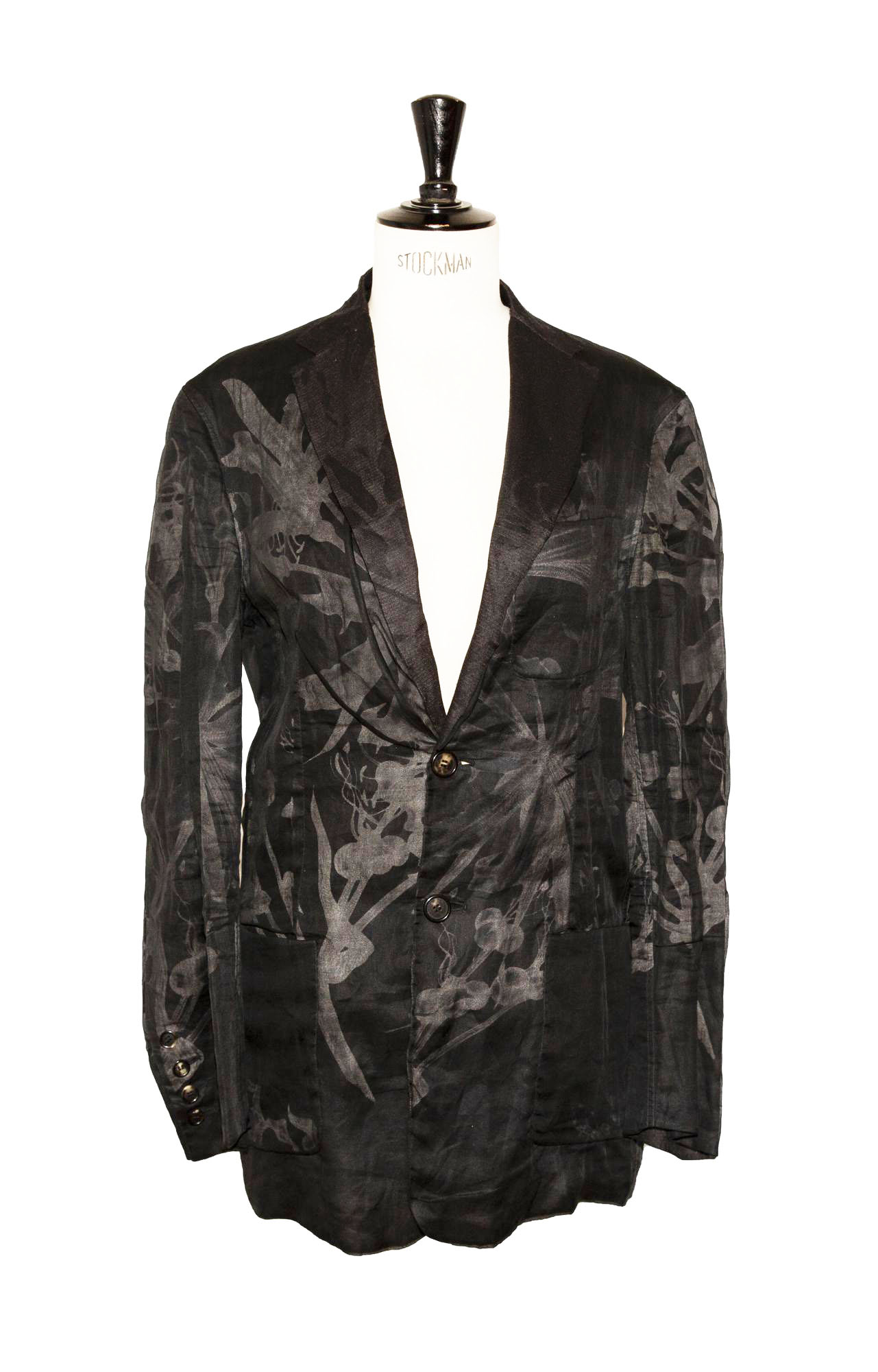 Giacca da uomo in organza di cotone con stampa floreale con strato di organza. 2 bottoni, 2 tasche, taschino sul petto. Fodera interna 100 per cento seta. Made in Italy nei primi anni 2000, IT taglia 48. Ben conservata.