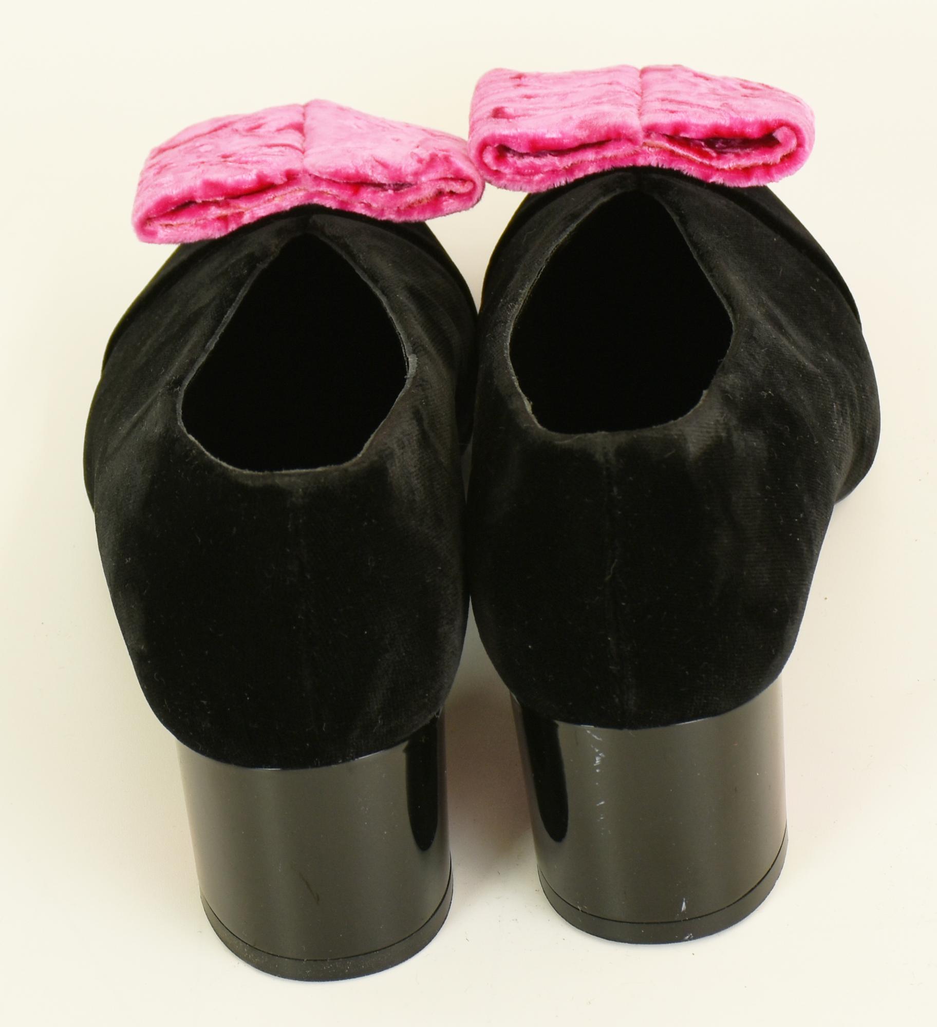 Pumps in velluto nero a punta con fiocco rosa sul davanti e fodera in pelle. Tacco di 5,5 cm. Numero 37. Prodotte in Italia. Mai indossate, perfettamente conservate.