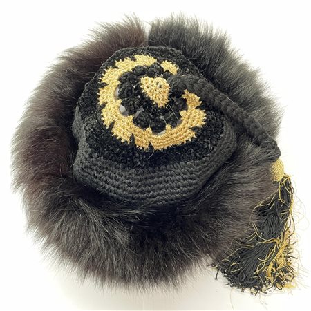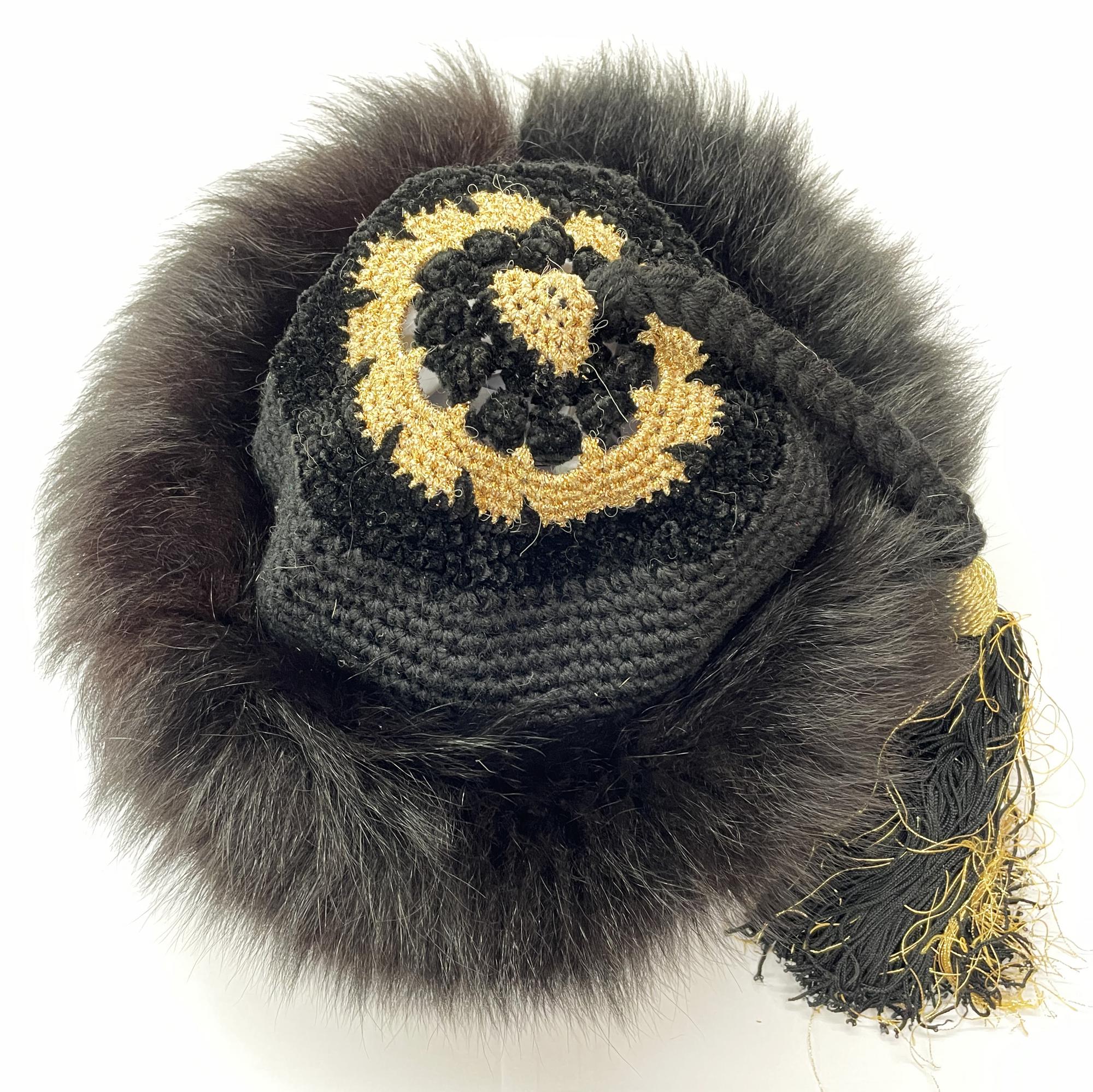 Iconic vintage Yves Saint Laurent gold and black Russian style tassel hat with fur trim. Ballet Russe YSL runway, circa 1976. Perfectly Preserved.