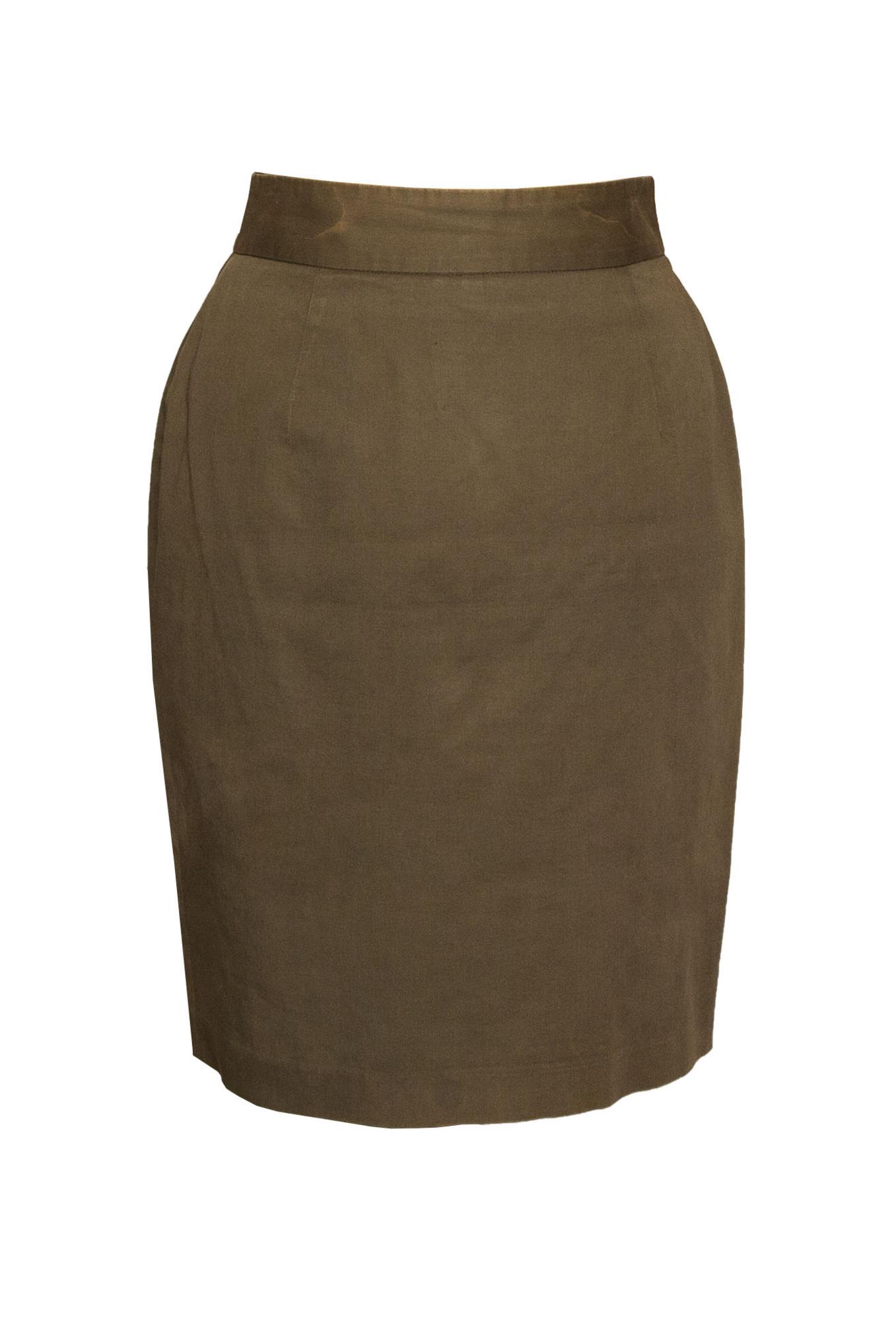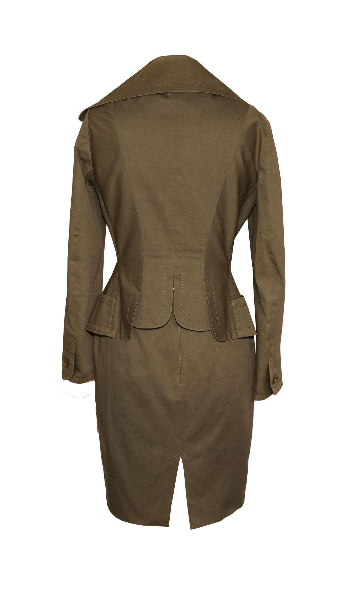 Changing green lined cotton suit. Jacket with wide neckline and skirt with center back slit, length cm 55 including the waist bend. Well preserved. Size IT 42 Made in Italy in the 90's.