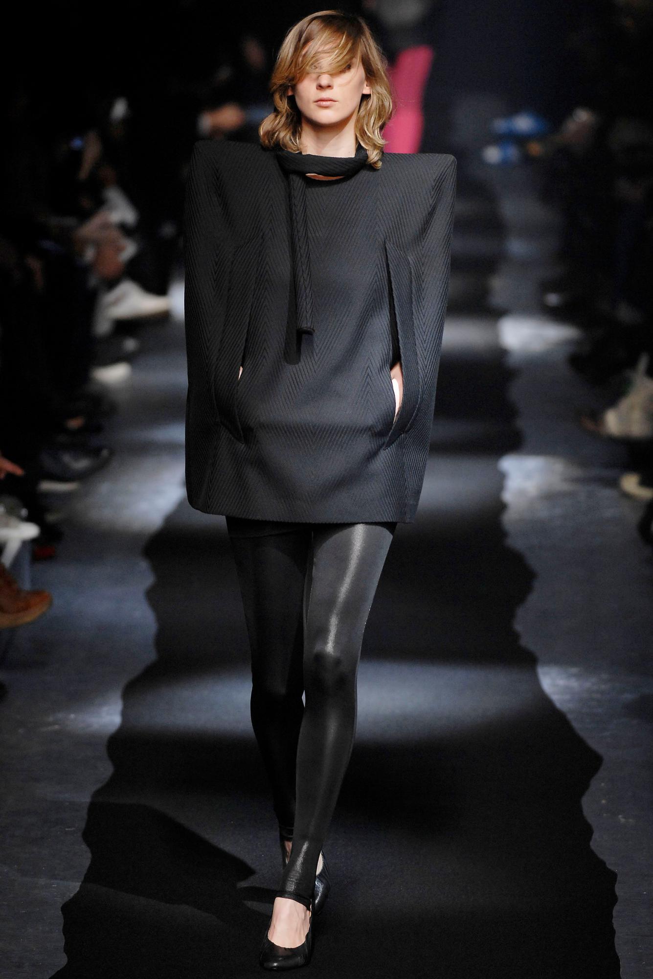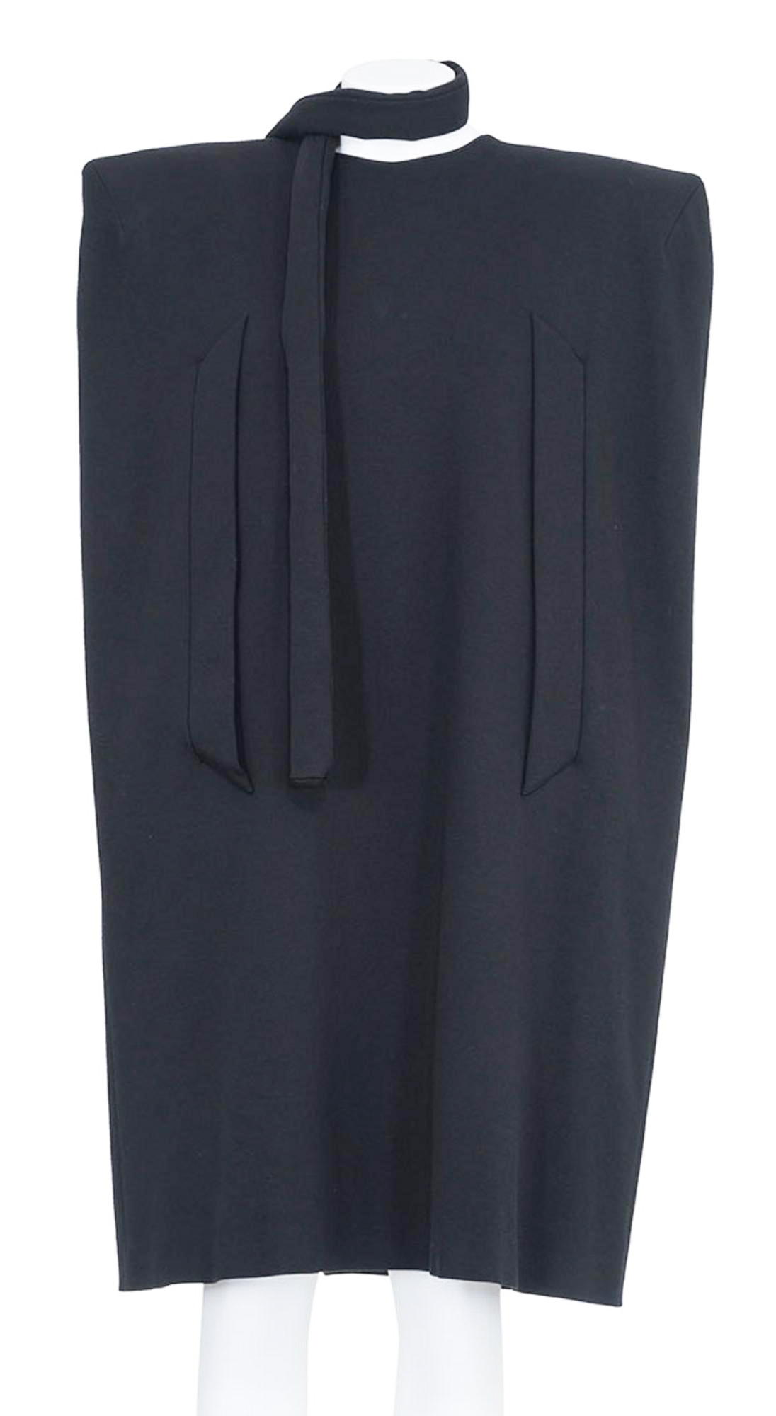 Rare cape dress with oversize structured shoulders from FW 07 collection, two inner pockets at front and buttons closure at back, tubular detachable scarf, fully lined. Size IT 42. 79 per cent viscose 18 per cent nylon 3 per cent elastane. Excellent conditions.