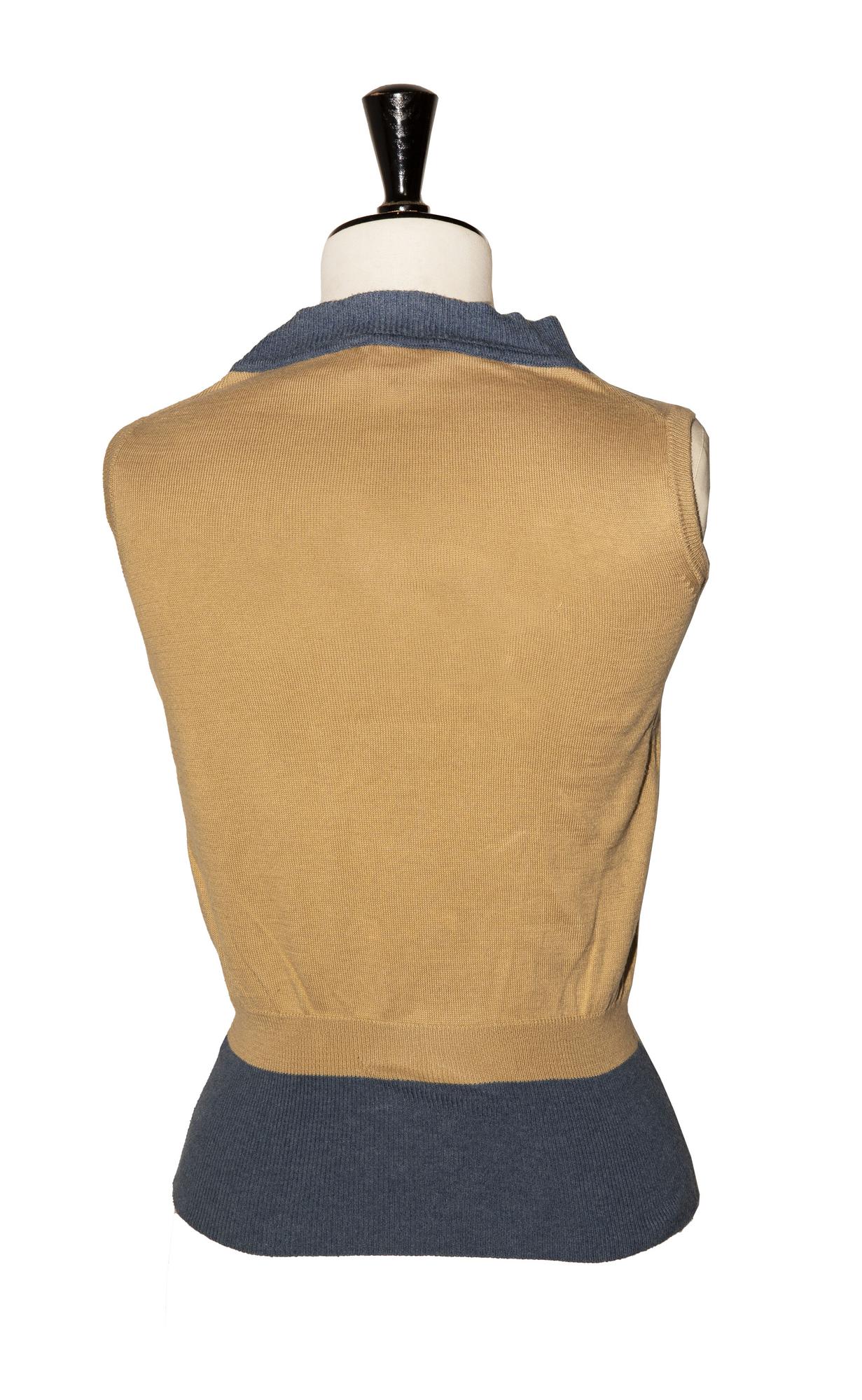 Two-tone cardigan with asymmetric fastening. Orb cotton yarn embroidered on the left hip. Made in Italy in the 90s. Size XS. Perfectly preserved.