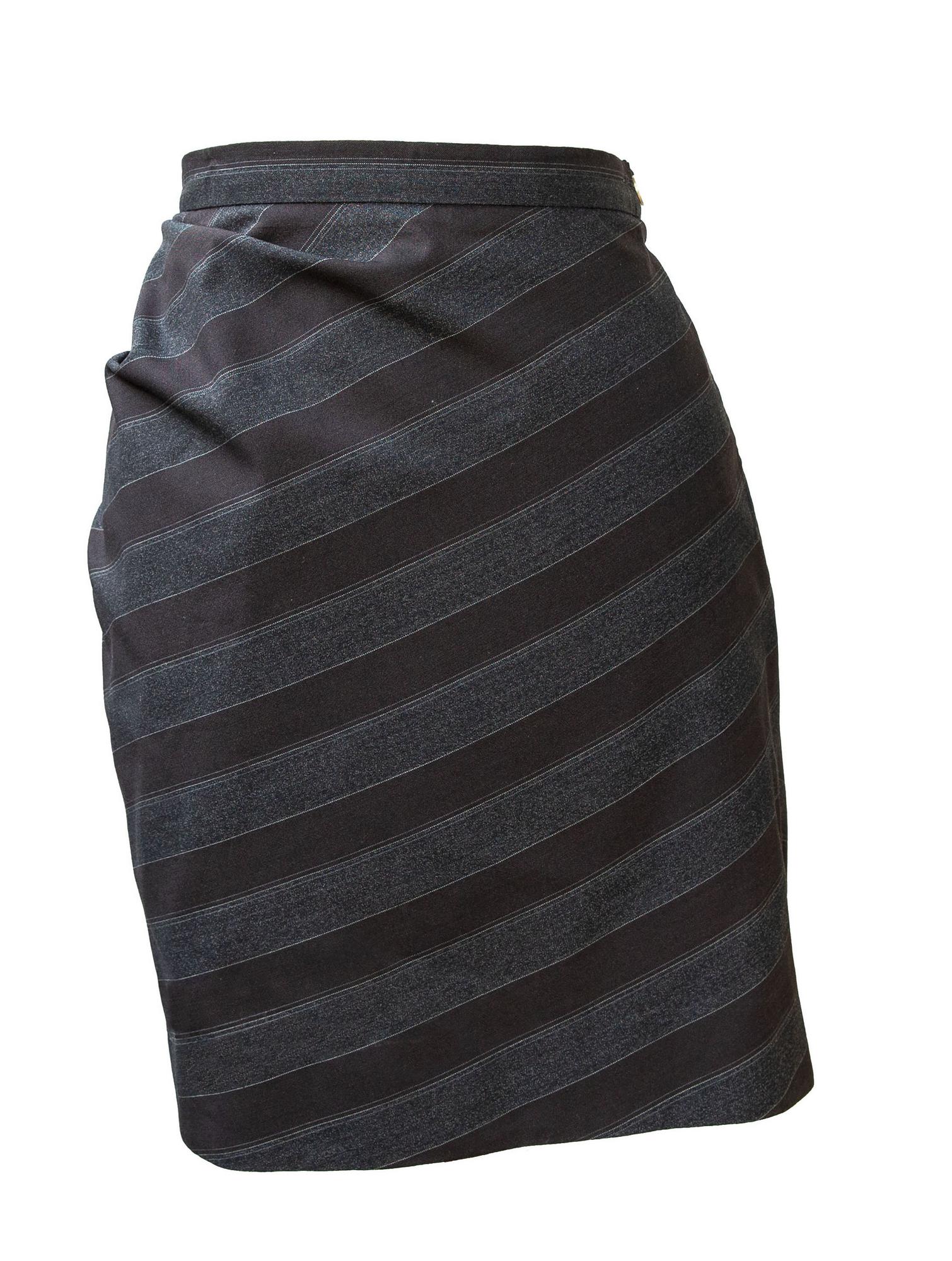 Lined pinstriped wool crepe skirt. Particular construction with 'panier' effect on the back. Made in Italy in the early 90s. Size IT 42. Perfectly preserved.