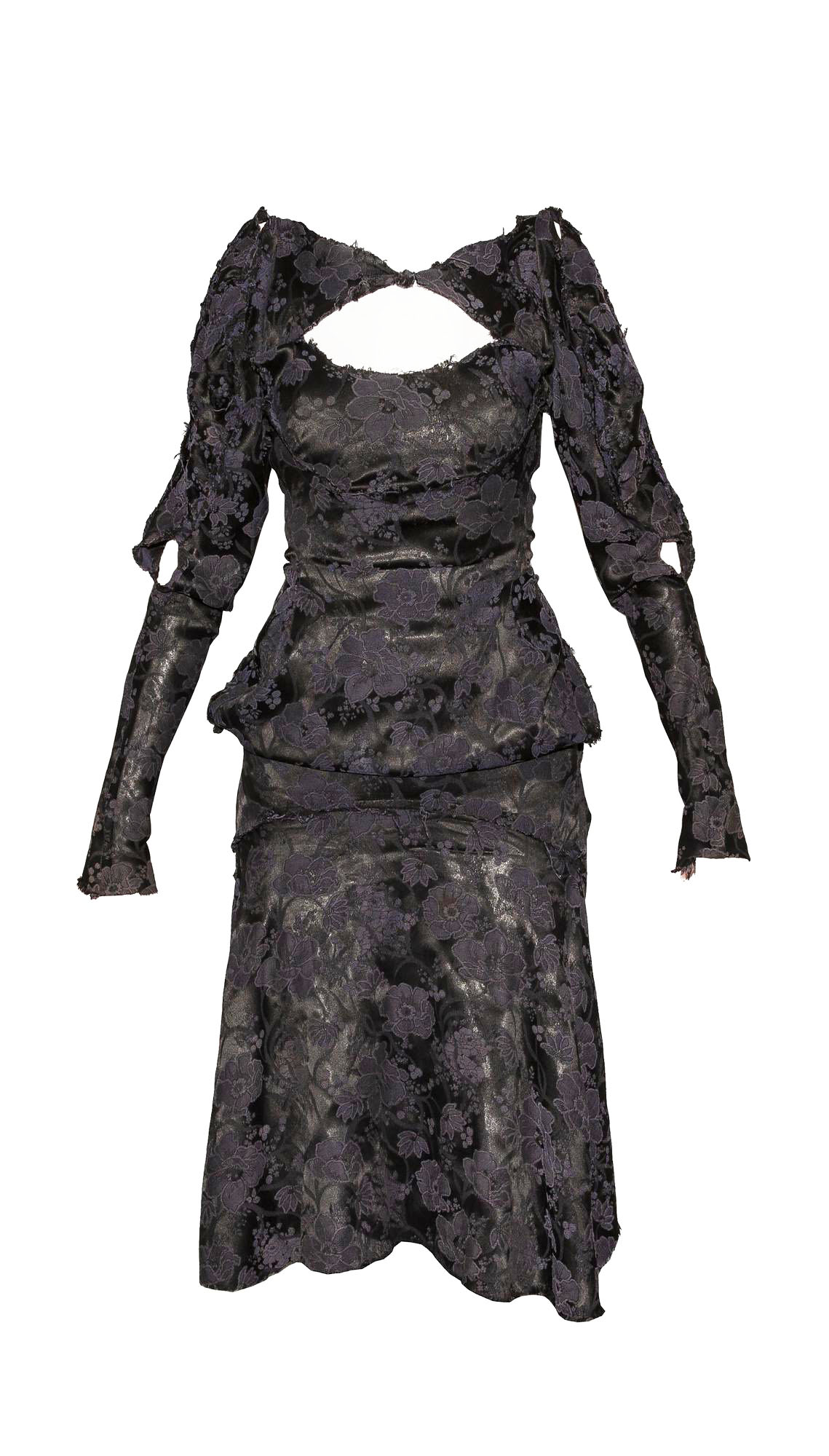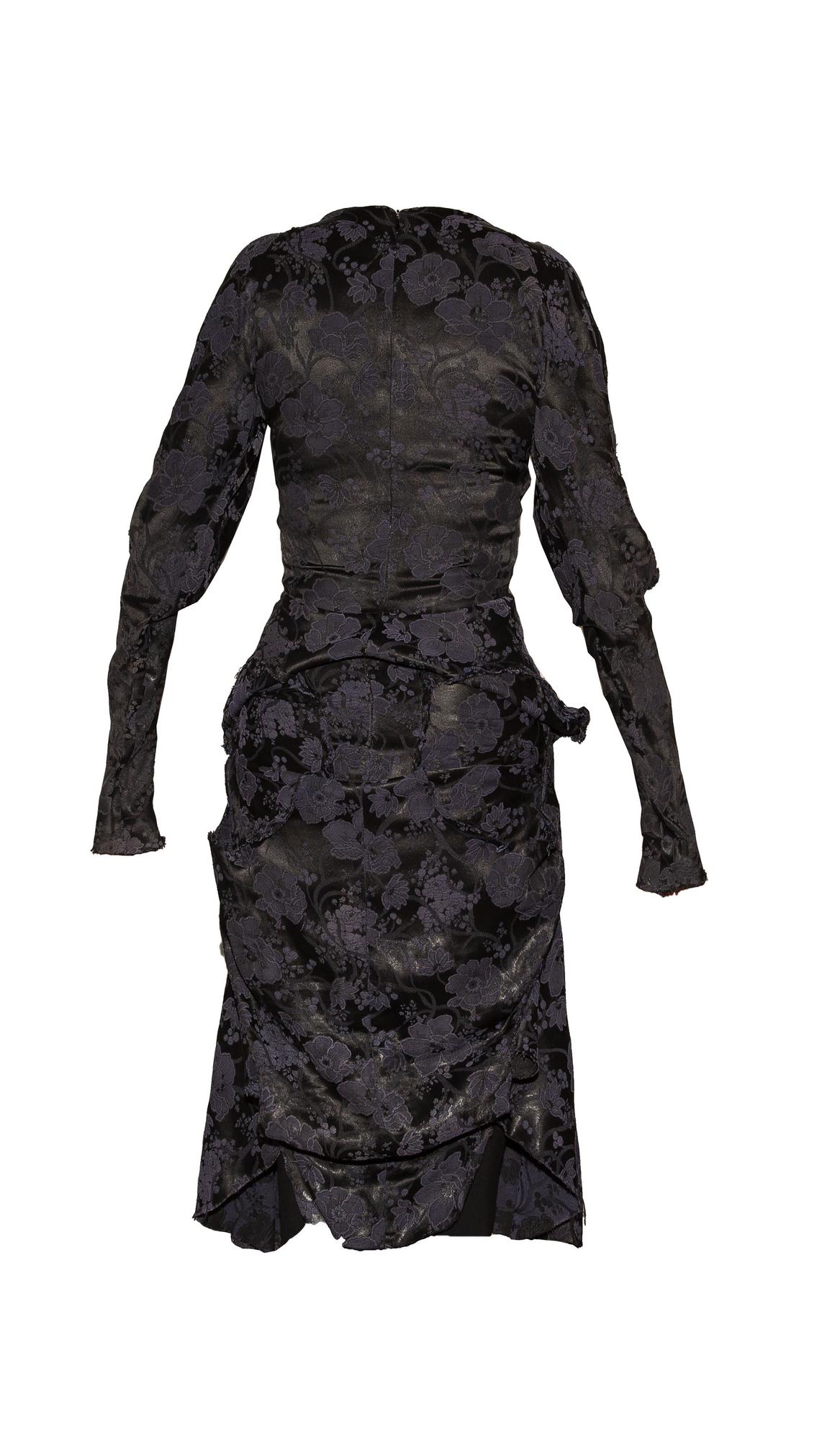 Unlined dress in jacquard fabric with midnight blue flower pattern, raw cut edges. Openings on the breast and sleeves.