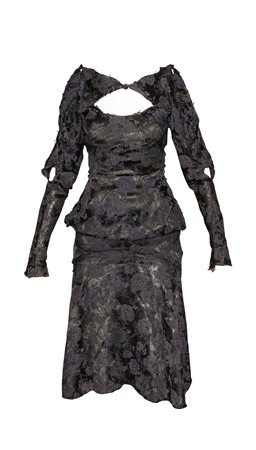 Abito sfoderato in tessuto jaquard con motivo a fiori colore blue midnight, margini tagliati a vivo. Aperture sul seno e sulle maniche.