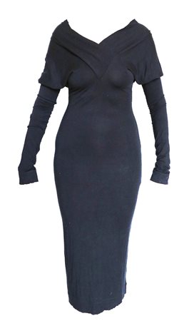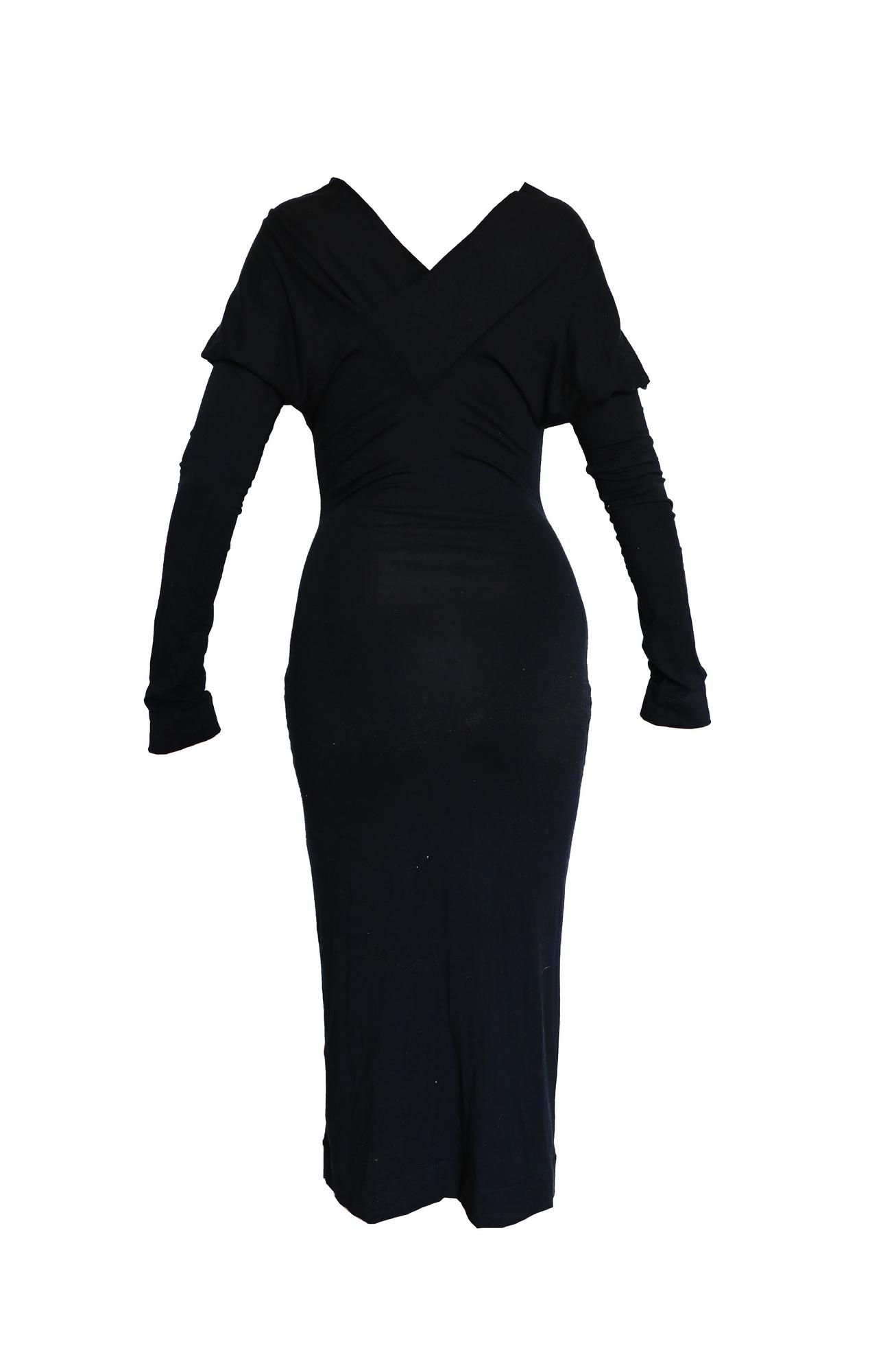 Abito lungo in jersey di viscosa nero con maniche a guanto e ampia scollatura che si puo' portare anche appoggiata sulle spalle scoperte. Made in Italy negli anni '90. Taglia L. Perfettamente conservato.