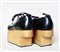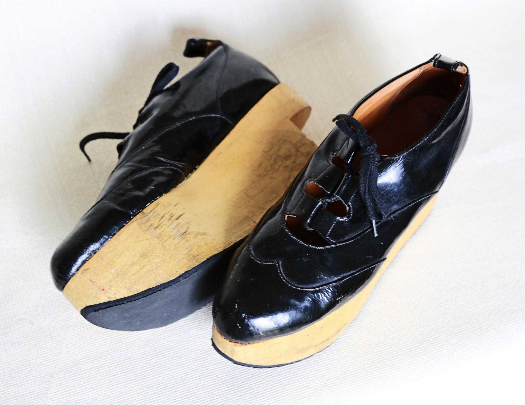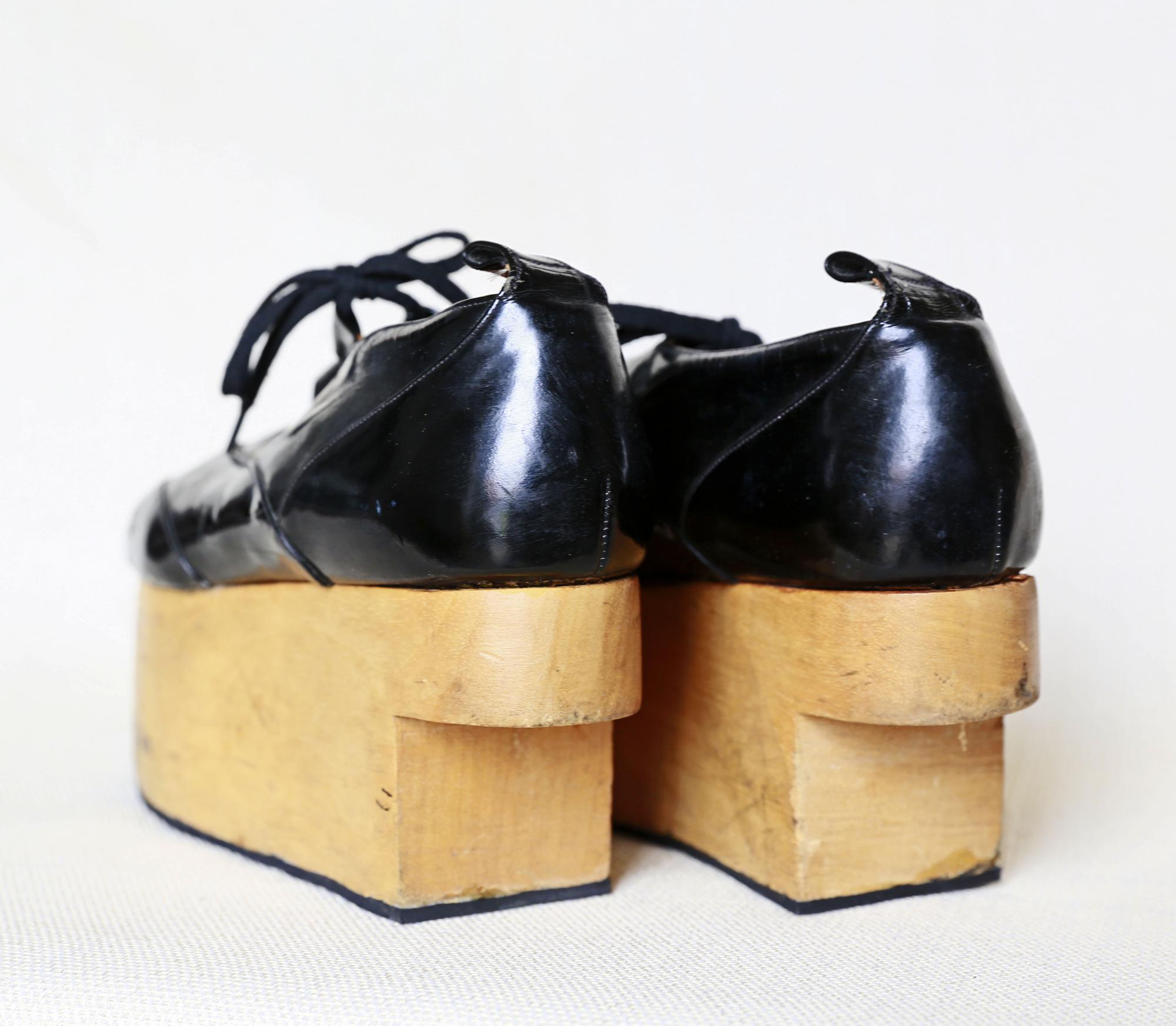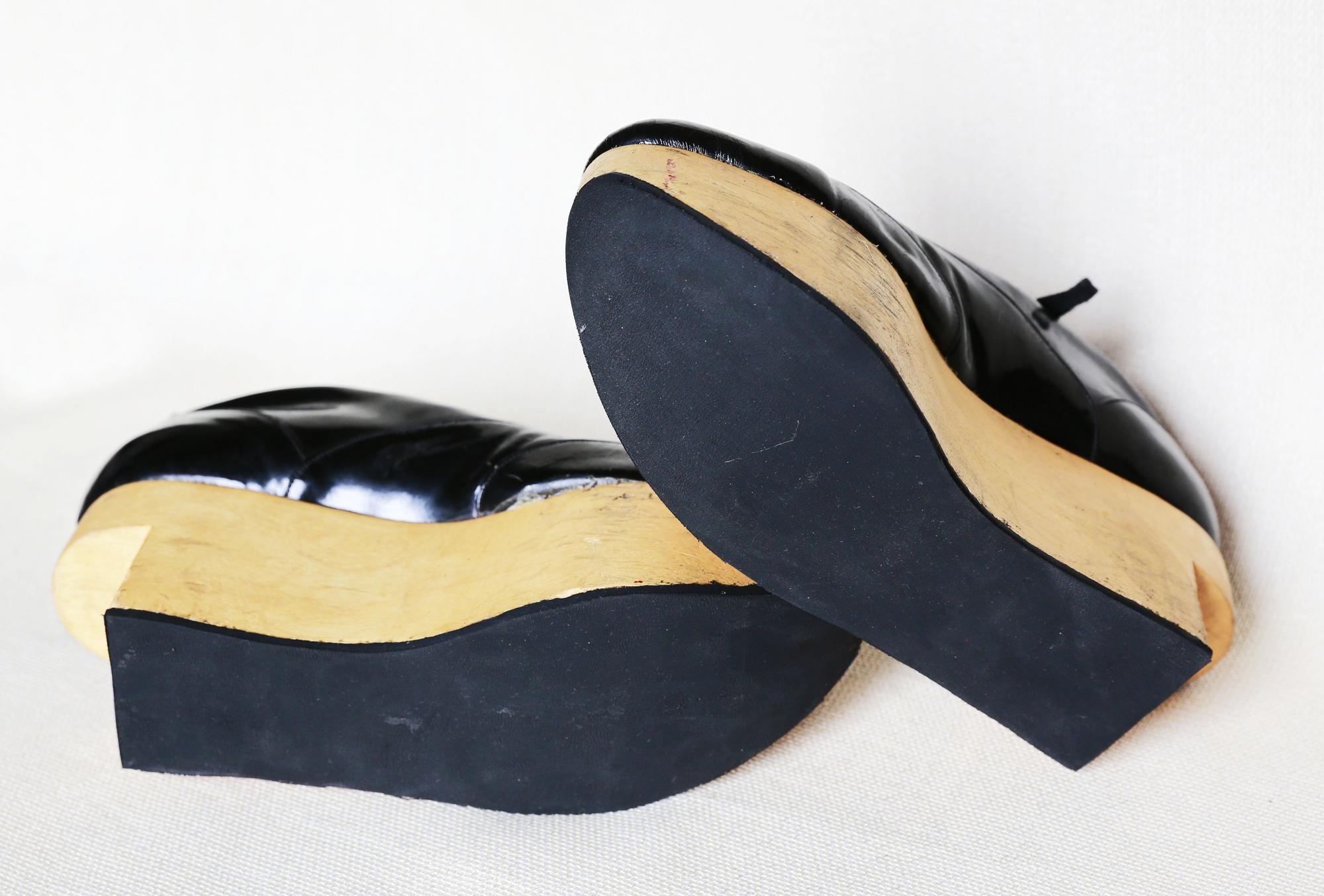 Women's black patent leather shoes with laces and yellow stained wooden platform soles, design by Vivienne Westwood in 1987. Made in England. Size 39. Well Preserved.