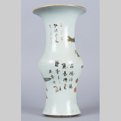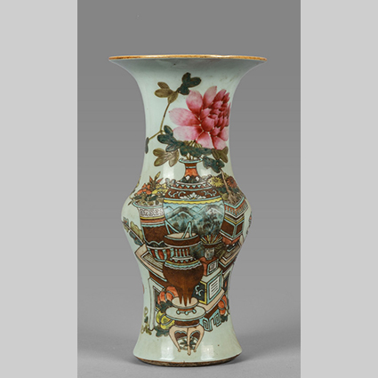 Vaso in porcellana a tromba decorato in policromia con vasi e peonia Cina sec.XX