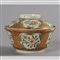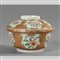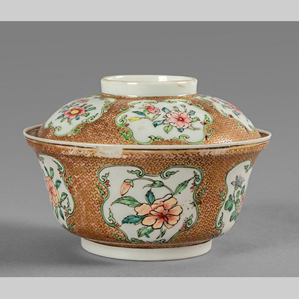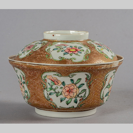 Ciotola con coperchio in porcellana decorata a riserve floreali su fondo dorato Cina sec.XIX