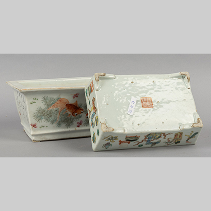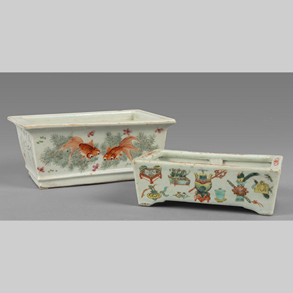 Due contenitori portapiante di forma rettangolare in porcellana decorata uno con carpe e l'altro con simboli taoisti Cina fine sec.XIX