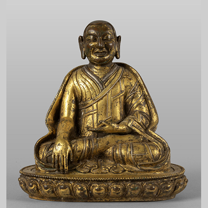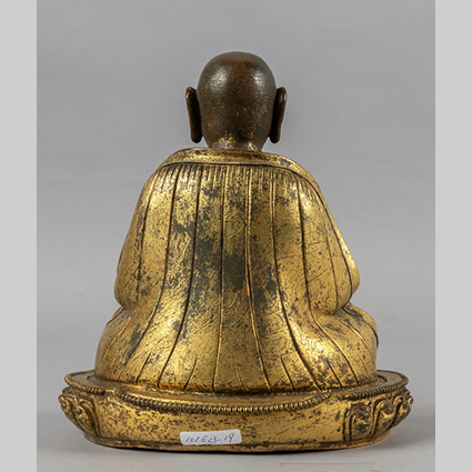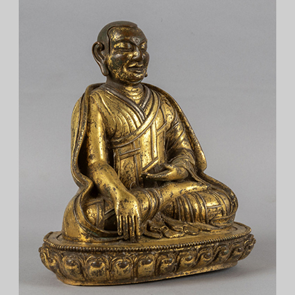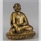 Antica statua in bronzo dorato raffigurante lama in Bhumisparsa Mudra con tracce d'argento Tibet inizi sec.XV