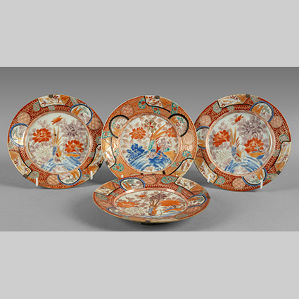 Quattro piatti in porcellana decorati in policromia Giappone sec.XIX