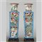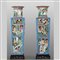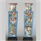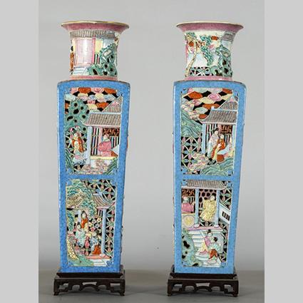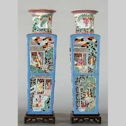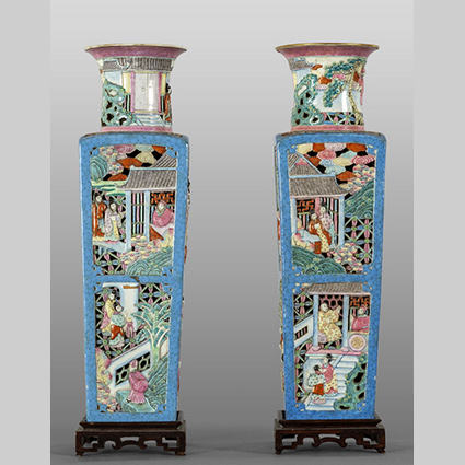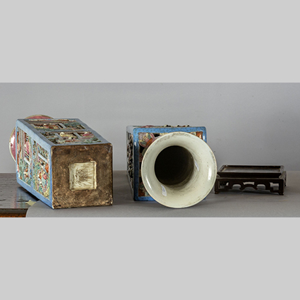 Coppia di vasi in porcellana policroma di forma quadrata decorati a bassorilievo a scene di vita cinese marcati alla base Cina sec.XIX